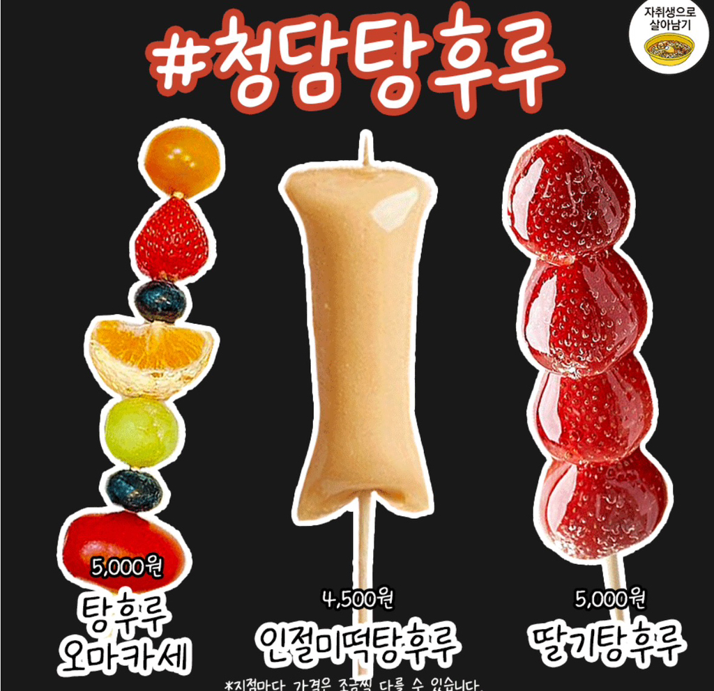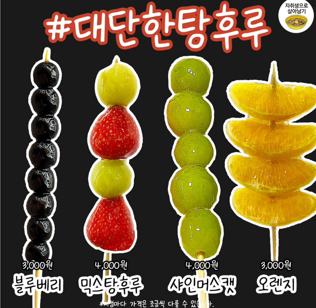 [기타]탕후루 브랜드별 가격 & 종류 작성자엘리멘탈탈탈탈|작성시간23.07.15|조회수35,179 목록 댓글 172 글자크기 작게가 글자크기 크게가 출처 : 여성시대 엘리멘탈탈탈탈왕가탕후루가 제일유명한듯...? 나는 파인애플만 먹어봤은데 맛있더라고 다음검색 현재 게시글 추가 기능 열기 북마크 공유하기 신고 센터로 신고 댓글 댓글 172 댓글쓰기 답글쓰기 댓글 리스트 작성자베르베르베르베르당근당근 | 작성시간 23.07.16 ㅈㄴ싫어 난 맛있는지도 모르겠음 작성자김승규1 | 작성시간 23.07.16 여기 조선족이 하는곳 아님? 작성자PonZoo | 작성시간 23.07.16 와 엄청 비싸다... 작성자웨이드앰버 | 작성시간 23.07.17 솔직히 너무 비싸 작성자밍밍이의 초코 쉬폰 만들기 | 작성시간 23.08.27 딸기 한소쿠리 설탕 한 팩 사서 집에서 만들면 10,000원 안에 만백성 먹여살릴 만큼의 양이던데 댓글 전체보기