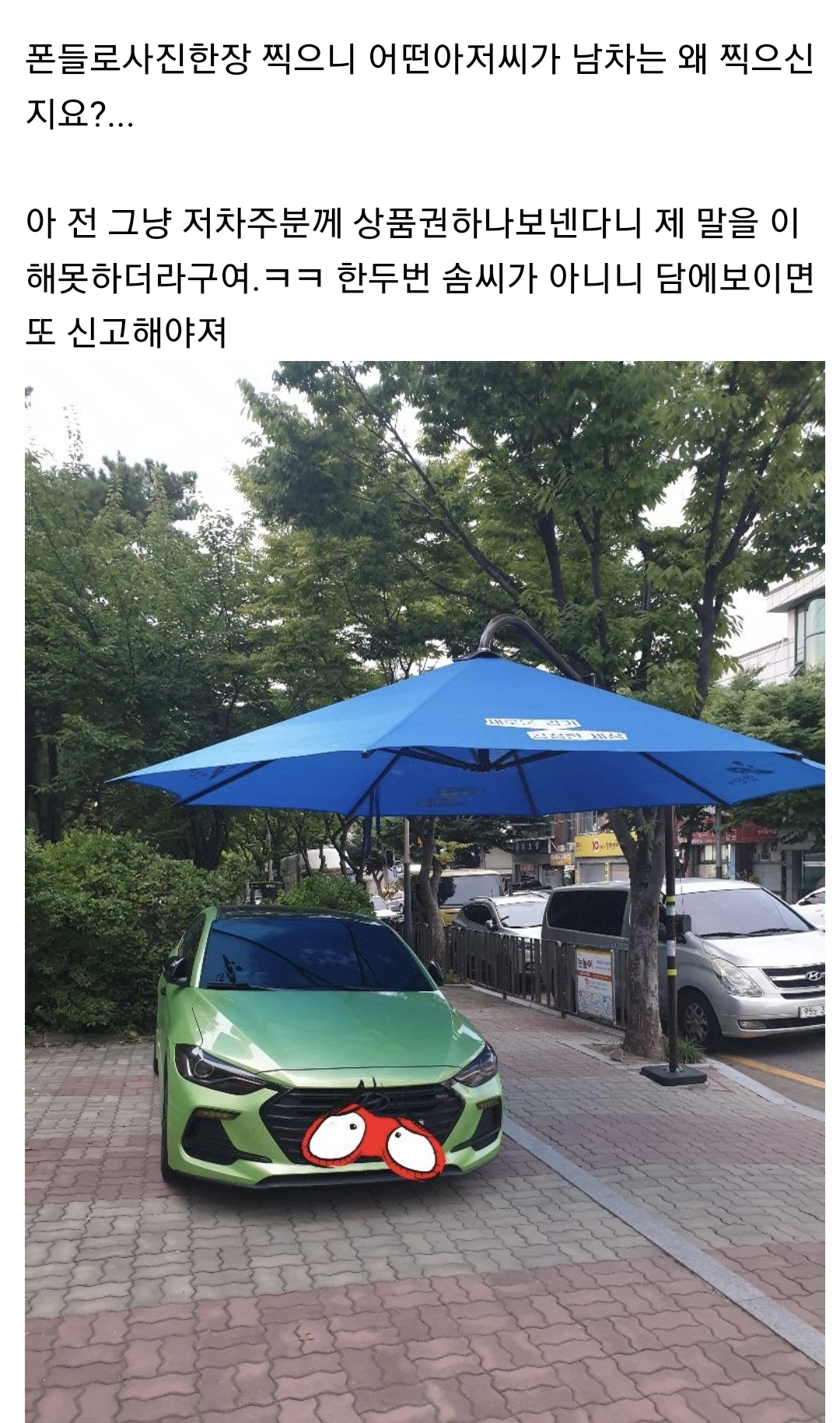 [스크랩] [흥미돋]여름이면 나타나는 자동차 그늘막 주차 작성자59오구|작성시간23.07.15|조회수46,127 목록 댓글 27 글자크기 작게가 글자크기 크게가 출처 : 여성시대 X file 다음검색 스크랩 원문 : *여성시대* 차분한 20대들의 알흠다운 공간 현재 게시글 추가 기능 열기 북마크 공유하기 신고 센터로 신고 댓글 댓글 27 댓글쓰기 답글쓰기 댓글 리스트 작성자널처음본그순간 | 작성시간 23.07.16 헐.. 진짜 생각도 못했다 ㅋㅋ 작성자(주)대한항공 | 작성시간 23.07.16 아니 그냥 그물막을 하나 사서 싣고 다녀,,저기 세우기도 어렵겠다 작성자아벤트시칼 | 작성시간 23.07.16 저런 사람들은 걍 일반 사람이랑 사고회로 자체가 다른듯 작성자junesnow | 작성시간 23.07.16 이기적 끝판왕 신고해줘야지 작성자구성태 | 작성시간 23.07.16 진심 놀랍다 댓글 전체보기
