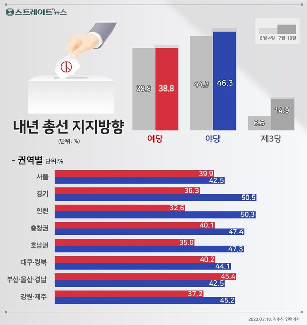 <스트레이트뉴스>가 여론조사기관 조원씨앤아이에 의뢰해 7월 15~17일 전국의 유권자 2,025명을 대상으로 ‘내년 총선에 어느 정당에 투표할 예정인가’ 물었더니 ‘현 정권 견제를 위해 제1야당인 민주당’ 46.3%, ‘원할한 국정수행을 뒷받침하기 위해 여당(국민의힘)’ 38.8%, ‘기존 양당이 아닌 제3세력’ 14.9%였다.