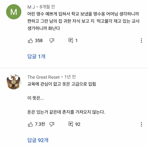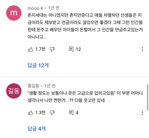 작성자Sunrise sunset 작성시간 23.07.20 아 이거보고 생각났는데 나 초딩때 반장하는데 선생님이 하도 나한테 뭐라하고 별일도 아닌걸로 트집잡고 이래서 엄마한테 말했는데 어느순간 괜찮아졌거든 나중에 크고나서 들었더니 촌지 원한거고 원래 반장엄마들이 선생집에 인테리어 같은거 해주고 그랬는데 우리엄마가 그런거 몰라서 안해서 나 괴롭힌거였더라… ㅋ 그래서 결국 돈 갖다드렸나 했대 .. 나참 ㅋㅋㅋㅋ댓글보니까 그런 선생들 많았구나 애들한테 뭐하는짓인지;;