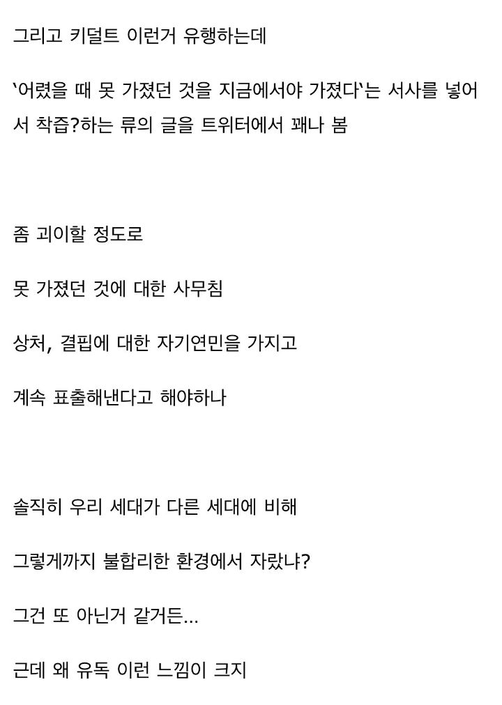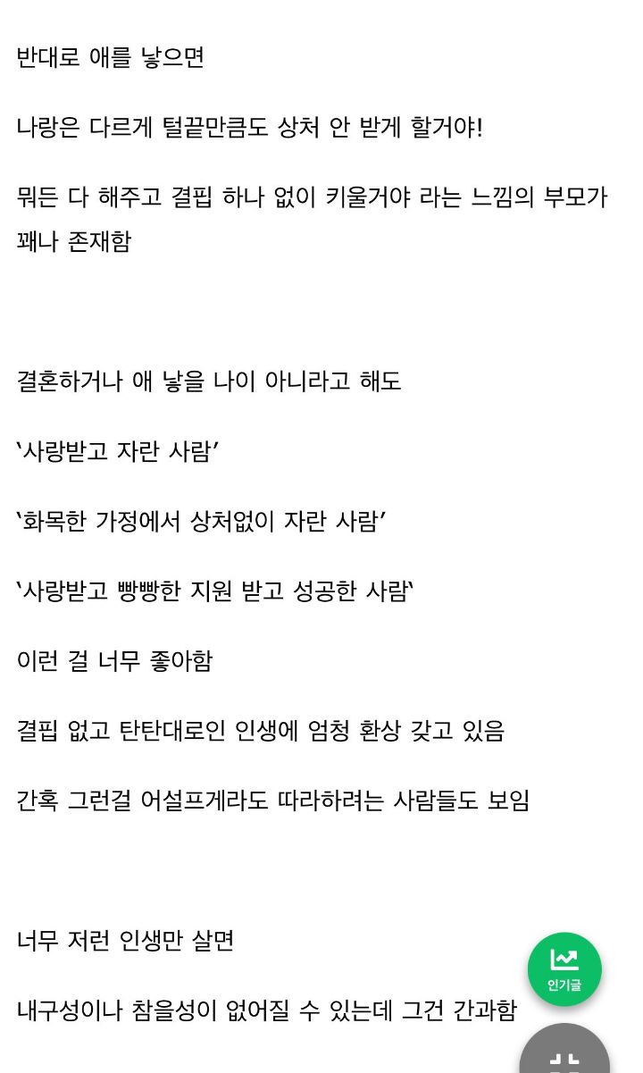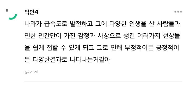 작성자팡팡파라바라팡방팡 작성시간 23.07.21 인터넷 발달로 불합리한 일들 너무 많이 듣고 읽어서 그런 것도 큰 듯. 그리고 교육수준 높아지면서, 어릴 때 부모가 했던 언행이 유년시절의 나에게 지대한 영향을 미쳤다는걸 알게된 것도 사실이고…