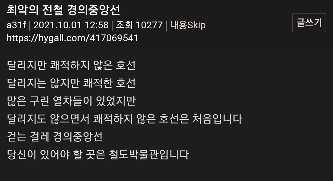 작성자peaceful. 작성시간 23.08.05 경중선 21분 연착돼서 또 댓글담 미친쓰레기노선