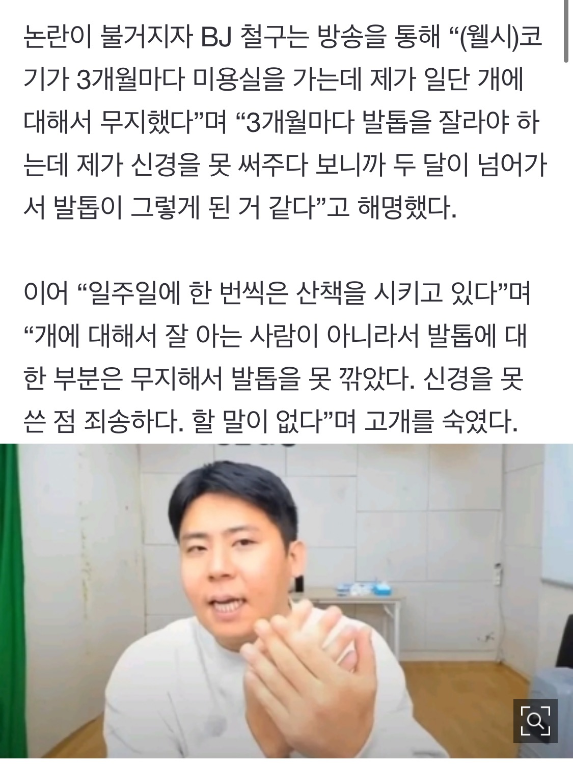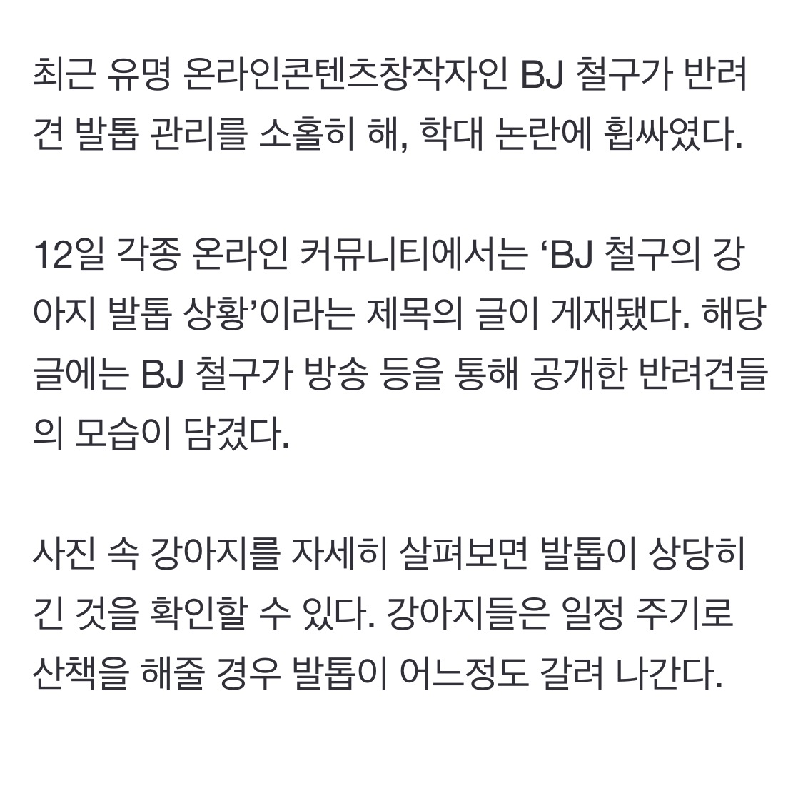 [스크랩] [흥미돋]“발톱 상태 심각”…BJ 철구, 강아지 학대 논란[이슈픽] 작성자룰루랄랄라라|작성시간23.07.22|조회수13,576 목록 댓글 45 글자크기 작게가 글자크기 크게가 출처 : https://naver.me/58FN7DjH“발톱 상태 심각”…BJ 철구, 강아지 학대 논란[이슈픽]반려견 1500만 시대를 맞아 반려견과의 행복한 동거를 위한 위생 관리의 중요성 또한 강조되고 있다. 발바닥 털자르기, 발톱 깎기, 귀 청소 등은 반려견에게 가장 기본적으로 해줘야 할 ‘기초미n.news.naver.com 다음검색 스크랩 원문 : *여성시대* 차분한 20대들의 알흠다운 공간 현재 게시글 추가 기능 열기 북마크 공유하기 신고 센터로 신고 댓글 댓글 45 댓글쓰기 답글쓰기 댓글 리스트 작성자파라랏튜 | 작성시간 23.07.22 동물학대범 작성자느개비새개비 | 작성시간 23.07.23 아 강쥐불쌍해 산책도안할듯 작성자아프거든???? | 작성시간 23.07.23 아 스발 저거 관절도 다 휘어 작성자존내배고프다 | 작성시간 23.07.23 학대범들은 사형시켜야함 작성자안냐하세용가리 | 작성시간 23.08.02 하 미친놈 댓글 전체보기