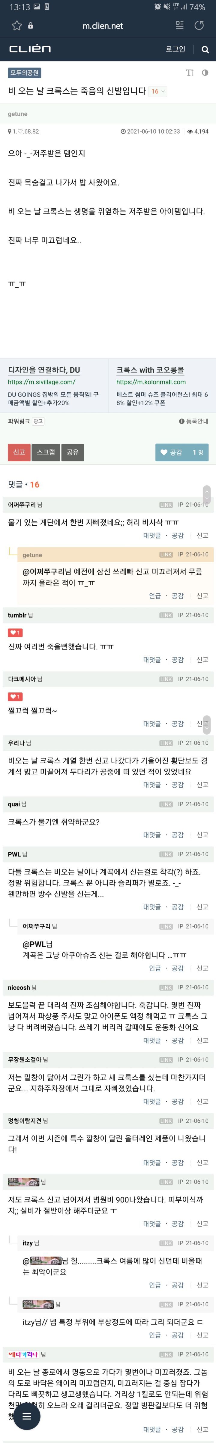 작성자우석따따 작성시간 23.07.23 내 크록스는 안미끄럽던데... 물놀이 필수템임.....모지..? 크록스마다 다른가..