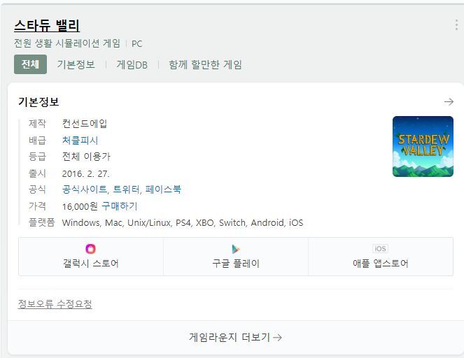 네이버에 치면 나오는 스타듀밸리 정보