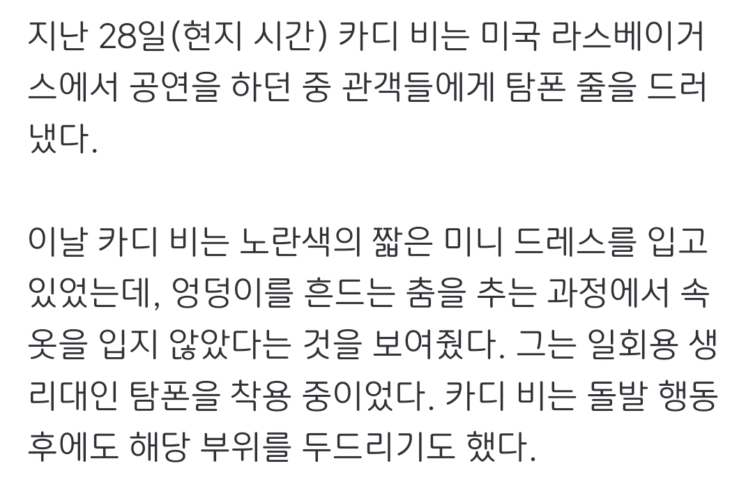 [흥미돋]공연 중 속옷 안 입고 팬들한테 탐폰 노출한 카디비..jpg 작성자아마레티|작성시간23.08.03|조회수73,047 목록 댓글 188 글자크기 작게가 글자크기 크게가 출처 : https://n.news.naver.com/entertain/article/312/0000621662 여성시대 아마레티뭔가 루머 같아서 트위터 서치하니까 찐임클다 썰릴까봐 영상은 안 퍼옴 다음검색 현재 게시글 추가 기능 열기 북마크 공유하기 신고 센터로 신고 댓글 댓글 188 댓글쓰기 답글쓰기 댓글 리스트 작성자11:27 | 작성시간 23.08.04 윽... 작성자인팁.그잡채 | 작성시간 23.08.04 왜저러냐 진짜 작성자소년탐정김전일 | 작성시간 23.08.04 오 갓... 작성자트렛 | 작성시간 23.08.04 아아아아악 진짜 텍혐이다본사람들 무슨 죄 작성자커피한잔할래여오오어 | 작성시간 23.08.04 도대체가 댓글 전체보기