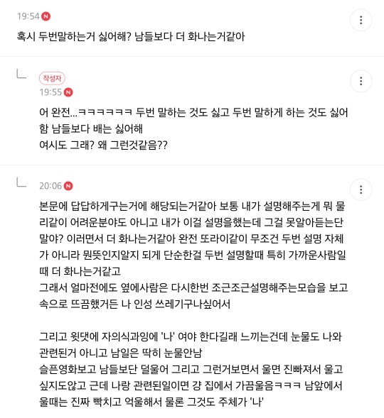 작성자은성아 작성시간 23.08.04 이해가 안되어서 두번 말하는건 괜찮은데 설렁설렁 듣고 헛소리하면 말하기 싫어짐ㅋㅋㅋ