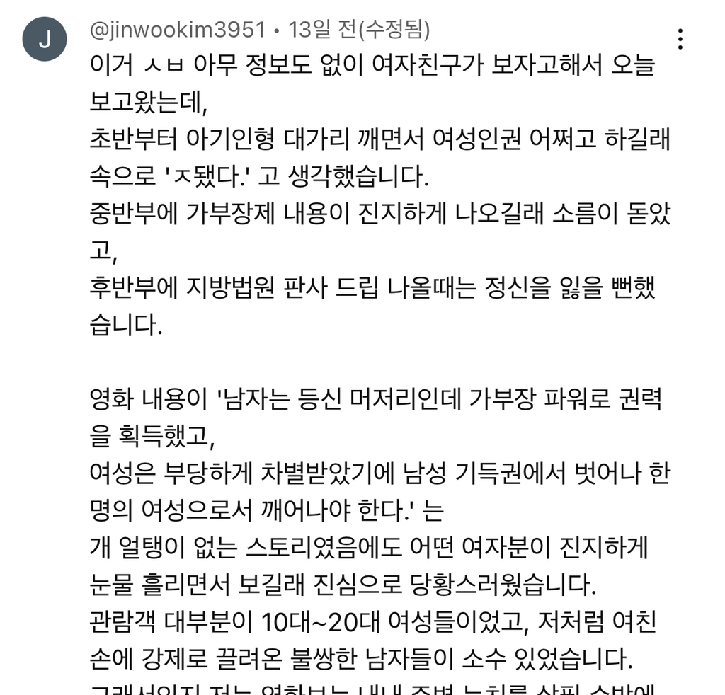 거기다 데이트 가서 여성이 남성한테 이런 영환줄 몰랐다고 미안하다 했다는 댓글 정말 많았음.
