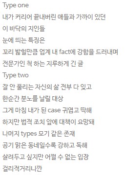 [흥미돋]에픽하이 Born Hater에서 유난히 인기 없었던 파트 작성자바샥바샥|작성시간23.08.10|조회수36,103 목록 댓글 174 글자크기 작게가 글자크기 크게가 출처 : 여성시대 바샥바샥 바로 버벌진트 파트 타입 원.. 어쩌구저쩌구타입 투.. 어쩌구저쩌구하핫 웃는 추임새마저 힘이 쫙 빠져서 웃김 ㅋㅋㅋㅋㅋ 참고로 이 노래에서 빈지노의 명대사어이없지 내 성공이 외모 덕이었다니 가사도 나옴 다음검색 현재 게시글 추가 기능 열기 북마크 공유하기 신고 센터로 신고 댓글 댓글 174 댓글쓰기 답글쓰기 댓글 리스트 작성자Bonjour | 작성시간 23.08.11 나도 송민호 파트 제일 싫어함 작성자크씬존버 | 작성시간 23.08.11 송민호 가사는 센척만 하는 것 같아보임 ㅋㅋㅋ젤 ㅂㄹ 작성자드럼스틱 | 작성시간 23.08.11 비치랑 머더퍼커 없으면 랩을 못하나 진짜.. 지루한 버벌이 그나마 나을지경 작성자역시 내가 귀여운 탓인가 | 작성시간 23.08.11 설명충파틐ㅋㅋㅋㅋㅋㅋㅋㅋㅋ 작성자계획하는여시 | 작성시간 23.11.19 송민호가 제일 별로야;;; 이 노래 망친놈 댓글 전체보기