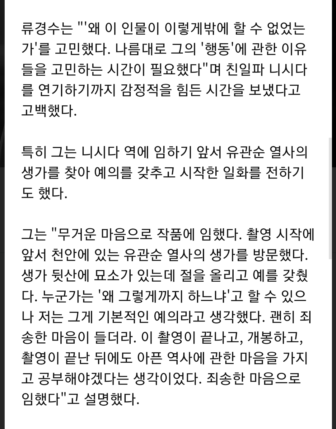 [여시뉴스데스크]류경수 "'항거' 촬영 전, 유관순 열사 생가 찾아…기본적 예의라 생각" 작성자서한솔|작성시간23.08.15|조회수3,128 목록 댓글 12 글자크기 작게가 글자크기 크게가 출처 : https://m.ajunews.com/amp/20190215171830452류경수 '항거' 촬영 전, 유관순 열사 생가 찾아…기본적 예의라 생각 | 아주경제배우 류경수가 친일파 니시다(정춘영)을 연기한 소감을 전했다.15일 오후 서울 광진구 자양동에서는 영화 항거: 유관순 이야기(감독 조민호·제작 ㈜디씨지플러스 조르바필름·배급 ㈜롯데엔터www.ajunews.com우연히 항거 영화 사진 찾다가 찾은 기사 다음검색 현재 게시글 추가 기능 열기 북마크 공유하기 신고 센터로 신고 댓글 댓글 12 댓글쓰기 답글쓰기 댓글 리스트 작성자투수곽빈 | 작성시간 23.08.15 헐 개념있는 배우네 작성자존버는_승리한다 | 작성시간 23.08.15 이런 역사의식 있는 사람들이 잘되면 좋겠다 작성자ISF:P | 작성시간 23.08.15 멋지네 작성자피곤하다피곤해ㅐ | 작성시간 23.08.15 아 굿~~~^^ 작성자준호야프리다쏴라 | 작성시간 23.08.15 어 이 배우 어디 나왔더라...암튼 굿아 이태원 어쩌구 댓글 전체보기