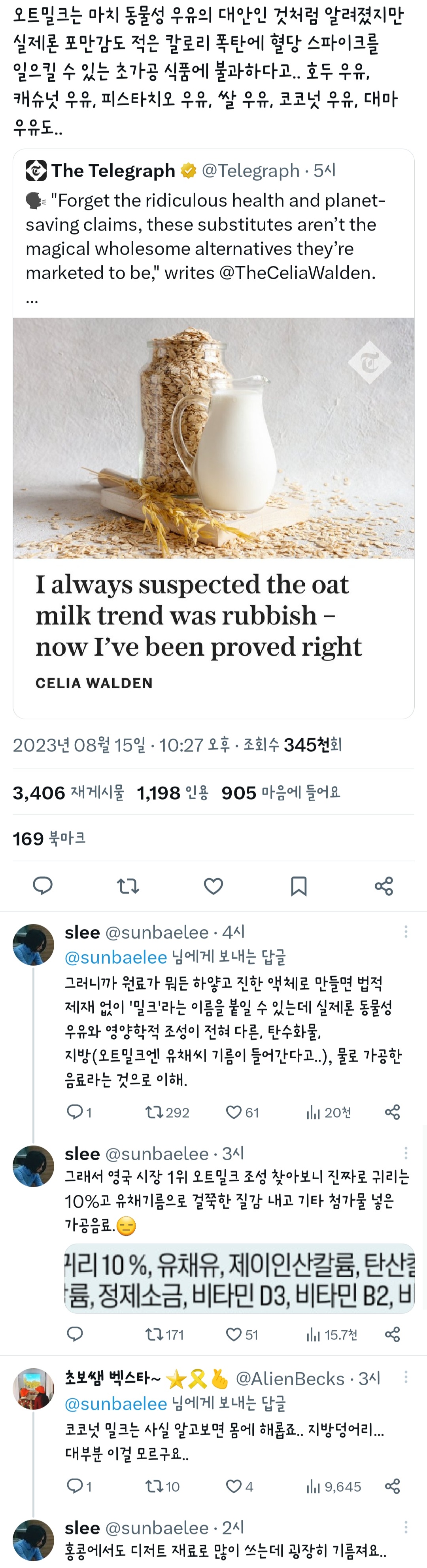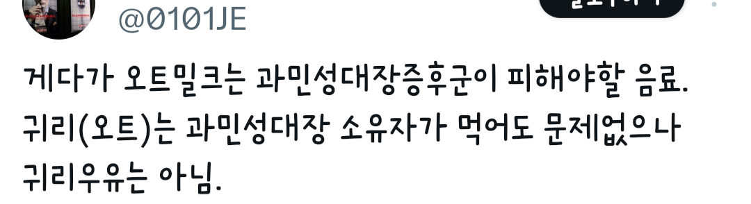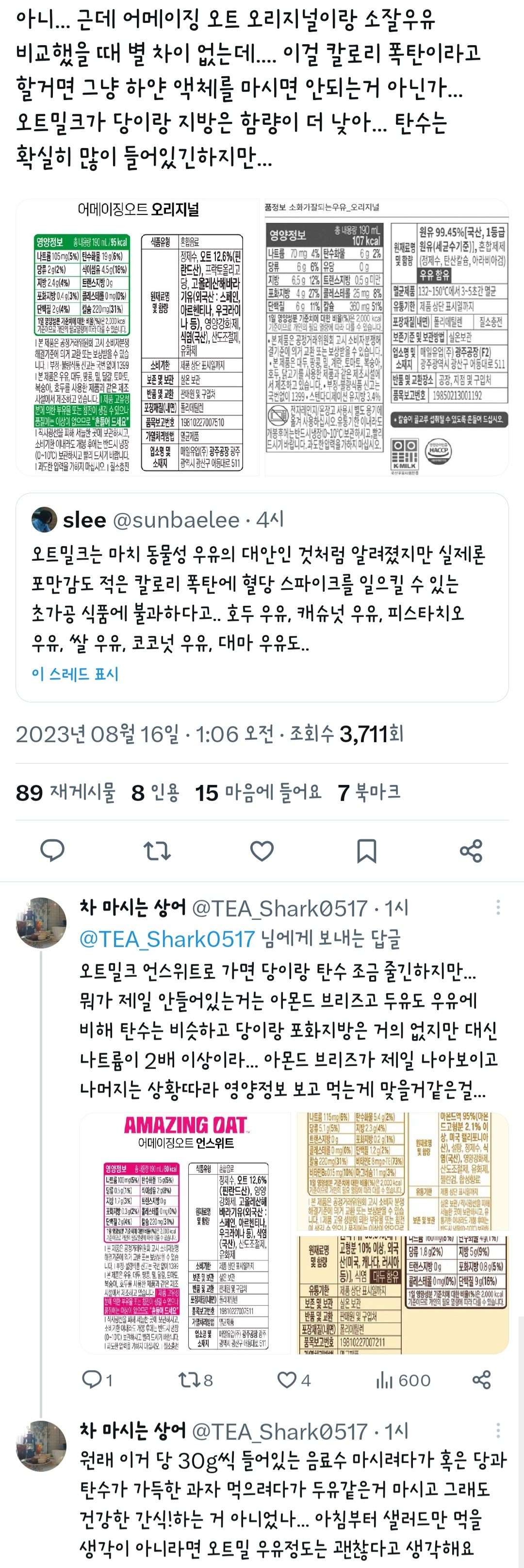 하지만 모든것을 감수하고도 유당불내증등 원유 관련해서 불편감을 느끼는 사람들과 동물성 우유를 대체하려는 사람들에게는 오트밀크같은 대체 가능한 선택지가 있다는 점! 그저 대체유가 백퍼센터 건강한것만은 아니다.....!가 초점인듯 합니동. 당뇨인 여시들이 조금 더 관심을 가져야 할 이슈인듯 해. 어떤것들은 혈당이 생각보다 가파르게 오르는듯. 그리고 탄수가 의외로 높은 대체유도 많다 이정도? 먹더라도 알고먹자, 확인하고 먹자는 취지의 글~!