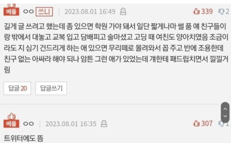 [흥미돋]SM 신인 아이돌 그룹 ‘라이즈 멤버 소희’ 과거 일진 논란을 알아보자 작성자키레인|작성시간23.08.16|조회수110,426 목록 댓글 482 글자크기 작게가 글자크기 크게가 출처 : 여성시대 키레인소희라이즈 메인보컬 추정본명 : 이소희출생 : 2003년 11월 21일 (19세)국적 : 한국학력 : 시흥능곡고등학교SM 신인 남돌 라이즈의 멤버 소희 과거 사진이 발 빠르게 돌며 논란을 야기하고 있음 한다리 두다리 건너까지 네이트판에 인증글 올리며 해당 멤버의 질이 안좋았다는 걸 폭로하는 중..싼티 달글에 나올 법한,,옆 친구 문신 있다고 알려주는 사진인듯그만 알아보자 다음검색 현재 게시글 추가 기능 열기 북마크 공유하기 신고 센터로 신고 댓글 댓글 482 댓글쓰기 답글쓰기 댓글 리스트 작성자케이끄 | 작성시간 23.09.24 아니 어쩌다...? 인재가없나 작성자배고파존나배고파너무배고파 | 작성시간 23.09.26 말도안돼 작성자Josef Lee | 작성시간 23.10.05 헐;; 작성자예민하게살 | 작성시간 23.11.28 진짜 싫다 작성자Now I’m crying in my room | 작성시간 23.12.03 싼티달글 ㅜㅜㅜㅜ 댓글 전체보기