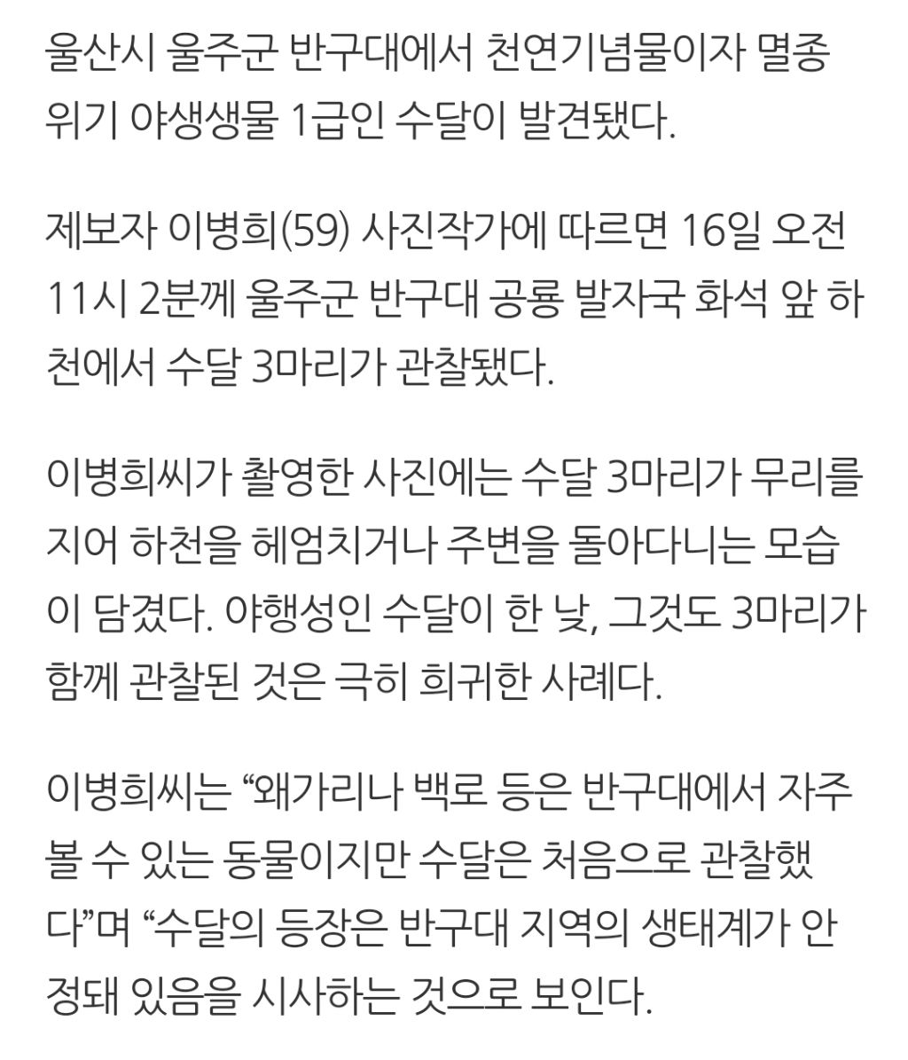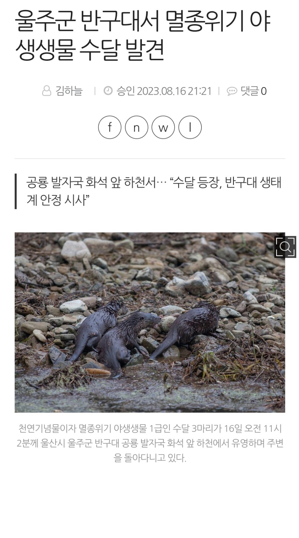 [여시뉴스데스크]울주군 반구대서 멸종위기 야생생물 수달 발견 작성자습지의사랑|작성시간23.08.16|조회수4,096 목록 댓글 6 글자크기 작게가 글자크기 크게가 출처 : http://www.ujeil.com/news/articleView.html?idxno=332052전문 출처로 다음검색 현재 게시글 추가 기능 열기 북마크 공유하기 신고 센터로 신고 댓글 댓글 6 댓글쓰기 답글쓰기 댓글 리스트 작성자궁이 | 작성시간 23.08.16 오! 작성자Toruk makto | 작성시간 23.08.16 수달들아 오래오래살아! 작성자정뚝떨 | 작성시간 23.08.17 대박 작성자먀미 | 작성시간 23.08.17 후앵 기엽다;; ㅜㅜ 건강하게 살으렴 🫶🏻🫶🏻 작성자사랑은 나도 모르는 새에 | 작성시간 23.08.17 어머머 귀야워라 ㅠㅠ 댓글 전체보기