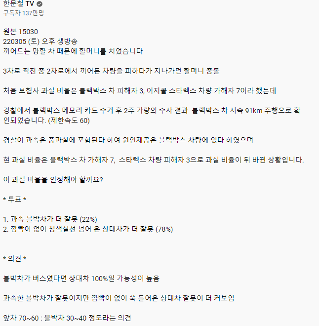 [스크랩] [기타]한문철) 끼어드는 차 때문에 할머니를 치었습니다. 작성자flflf|작성시간23.08.16|조회수26,101 목록 댓글 253 글자크기 작게가 글자크기 크게가 다음검색 스크랩 원문 : 도탁스 (DOTAX) 현재 게시글 추가 기능 열기 북마크 공유하기 신고 센터로 신고 댓글 댓글 253 댓글쓰기 답글쓰기 댓글 리스트 작성자햅삐엔딩 | 작성시간 23.08.18 뭘 잘했다고 쳐올리냐 작성자안도르 | 작성시간 23.08.18 미친놈이네 이거 작성자다크크리스피초코볼 | 작성시간 23.08.18 뒤져.. 작성자프리짓 | 작성시간 23.08.18 속도 ㅅㅂ 작성자방귀쟁이뿡뿡이 | 작성시간 23.08.18 저런 차선 조심해야돼 꼭 저렇게 막히는 차선에서 한대씩 끼어듦 ㅡㅡ근데 쟤는 버스도 아닌데 버스전용차선을 90키로로 달린거야ㅡㅡ? 미친거아님....?? 댓글 전체보기