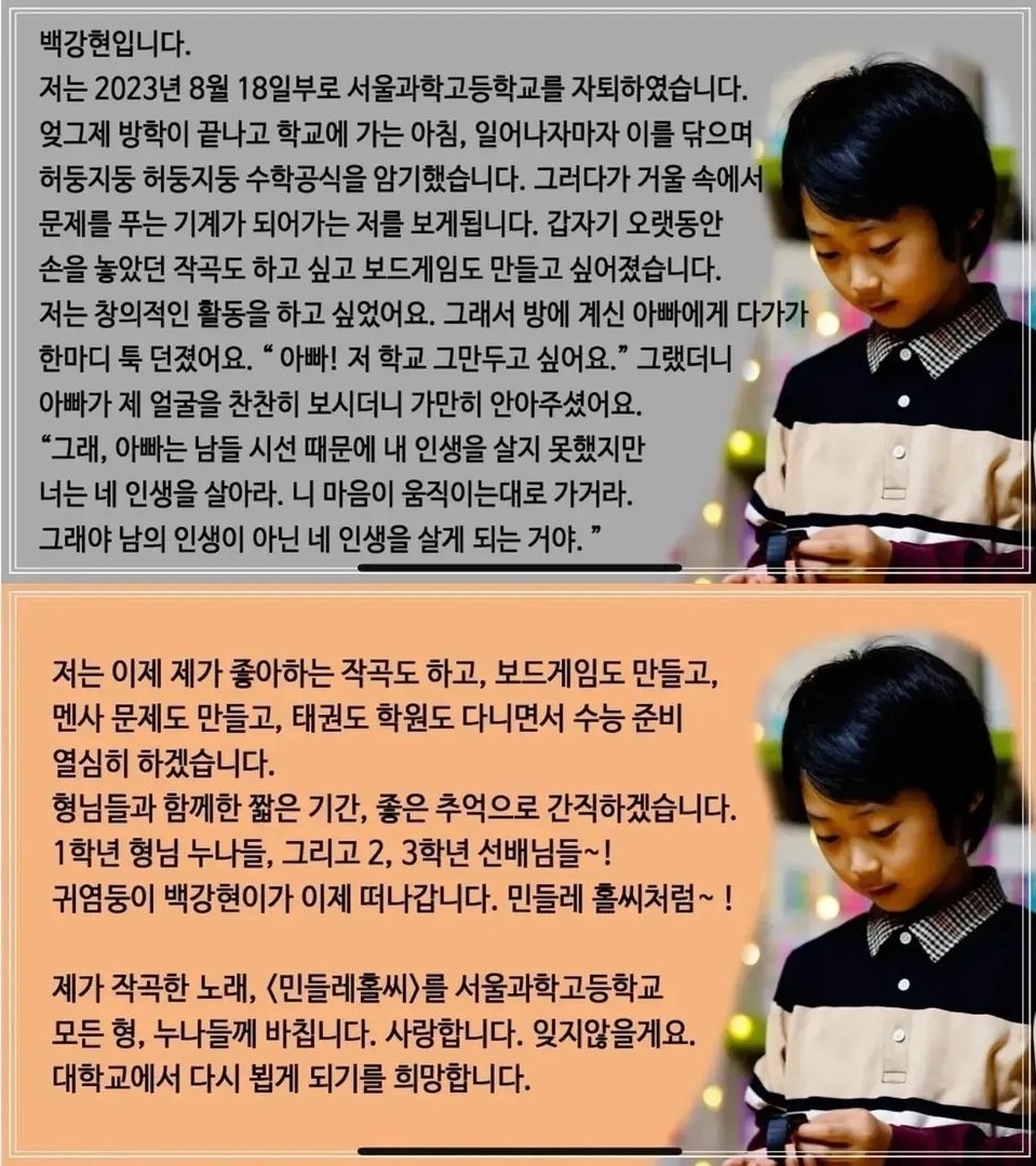 [칵.cxxxx]서울과학고를 자퇴한 백강현 작성자서한솔|작성시간23.08.20|조회수37,670 목록 댓글 98 글자크기 작게가 글자크기 크게가 출처 : https://www.instagram.com/p/CwJeS26ySJd/?igshid=MTk0MGU0NTkxNA==로그인 • Instagram여기를 눌러 링크를 확인하세요www.instagram.com참고로 강현이는 2012년생으로 나이로만 따지면 초등학생임 인생 ㅎㅌㅊ 새끼들 다음검색 현재 게시글 추가 기능 열기 북마크 공유하기 신고 센터로 신고 댓글 댓글 98 댓글쓰기 답글쓰기 댓글 리스트 작성자건들면D진다 | 작성시간 23.08.21 서울과고는 애들 질이 한참 떨어지네^^ 진짜 저급하다! 작성자릴리트 | 작성시간 23.08.21 한심 작성자워너비비비 | 작성시간 23.08.21 느그들 보다 똑똑한디? 작성자냐히냐히리 | 작성시간 23.08.21 에휴 안타까워 애기한테 ㅠㅠ 그냥 좀 챙겨줘 니들 동생이라 생각하고 좀 작성자파마산오레간오 | 작성시간 23.08.21 하ㅠㅠ 진짜 맘아프다 댓글 전체보기