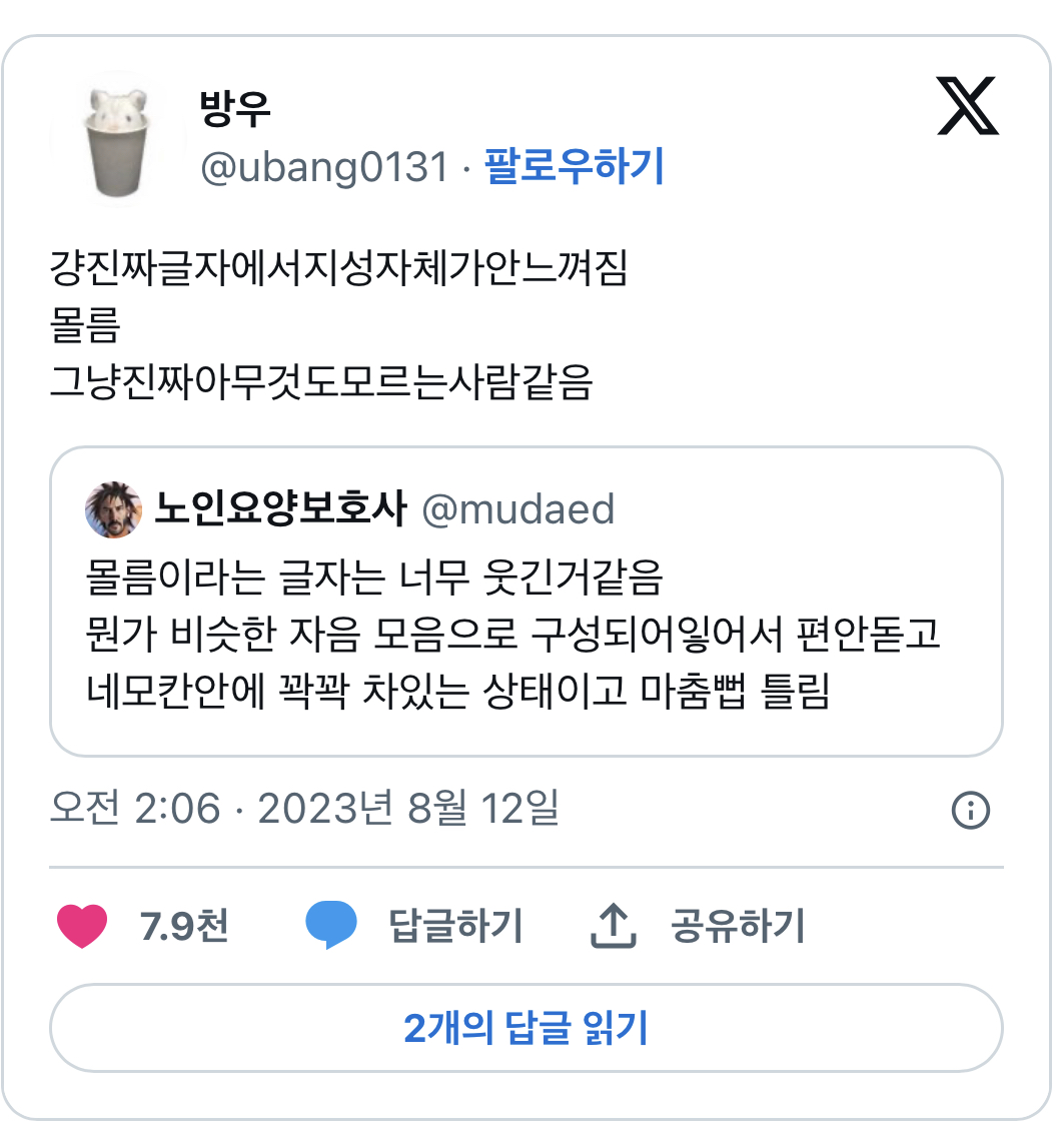 [흥미돋]몰름이라는 글자 너무 웃긴거같음.twt 작성자X file|작성시간23.08.21|조회수14,485 목록 댓글 56 글자크기 작게가 글자크기 크게가 출처 : https://twitter.com/ubang0131/status/1690046999008342016?s=46&t=v7QMmEln8v7WsADFKYn65g 몰룸은뒤집어도몰룸 다음검색 현재 게시글 추가 기능 열기 북마크 공유하기 신고 센터로 신고 댓글 댓글 56 댓글쓰기 답글쓰기 댓글 리스트 작성자국내산햇감자 | 작성시간 23.08.21 몰룸 뒤집어도 몰룸인거 귀엽닼ㅋㅋㅋ 작성자2년만에내현금자산1조만들었다 | 작성시간 23.08.21 ㅌㅋㅋㅋㅋㅋㅋㅋ진짜 한글은 재밌어 작성자노량진사시미칼 | 작성시간 23.08.21 몰룸 작성자방파제 | 작성시간 23.08.22 재밌닼ㅋㅋㅋㅋㅋㅋㅋㅋ 작성자왕크왕귀 | 작성시간 23.08.22 몰름 댓글 전체보기