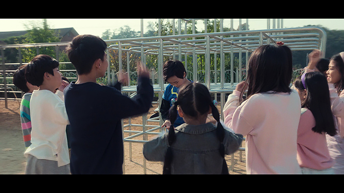 [정글짐 위에서 모든 아이들의 시선과 관심을 한 몸에 받는 남자아이]
