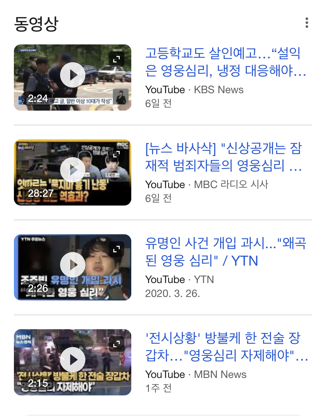 이건 구글에 '영웅심리'로 검색했을때 나오는 뉴스들이야.