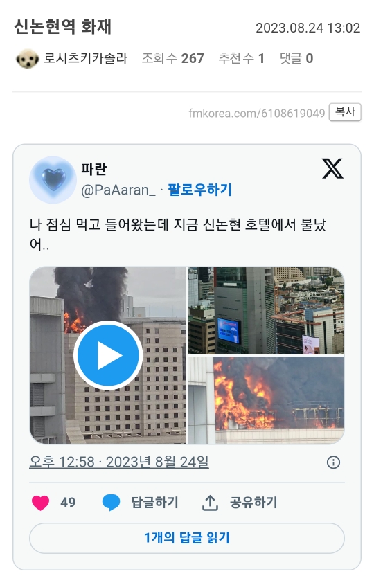 [기타]신논현역 화재/르메르디앙호텔 화재.. 연기 엄청 나는 중 작성자밀키스맛올라프|작성시간23.08.24|조회수9,161 목록 댓글 11 글자크기 작게가 글자크기 크게가 출처 : 밀키스맛올라프https://m.fmkorea.com/6108619049신논현역 화재https://twitter.com/paaaran_/status/1694559689957330956?s=12&t=7gTlq8CaVOqOwhylGYhp4gwww.fmkorea.com+호텔은 폐업했고 공실일거라네요 그나마 다행ㅜㅜ 다음검색 현재 게시글 추가 기능 열기 북마크 공유하기 신고 센터로 신고 댓글 댓글 11 댓글쓰기 답글쓰기 댓글 리스트 작성자죠르디. | 작성시간 23.08.24 저기 재개발예정이라 공실인게 그나마 다행이네 ㅜ 근데 어쩌다가 터진거지 공사하다가 뭐 건들었나 작성자상상할수없는 | 작성시간 23.08.24 공실이라 다행이긴하다ㅠㅠㅠ 작성자Be wise. | 작성시간 23.08.24 나 여기 사장아저씨 아는데...! 헐 작성자찰스박색 | 작성시간 23.08.24 아이고.. 어떡해.. 작성자hjytvs | 작성시간 23.08.24 지하철로 두정거장 떨어진 덴데 여기서도 연기 보이더라 댓글 전체보기