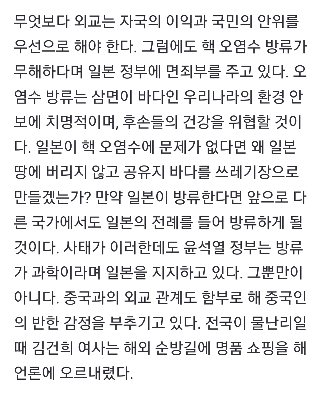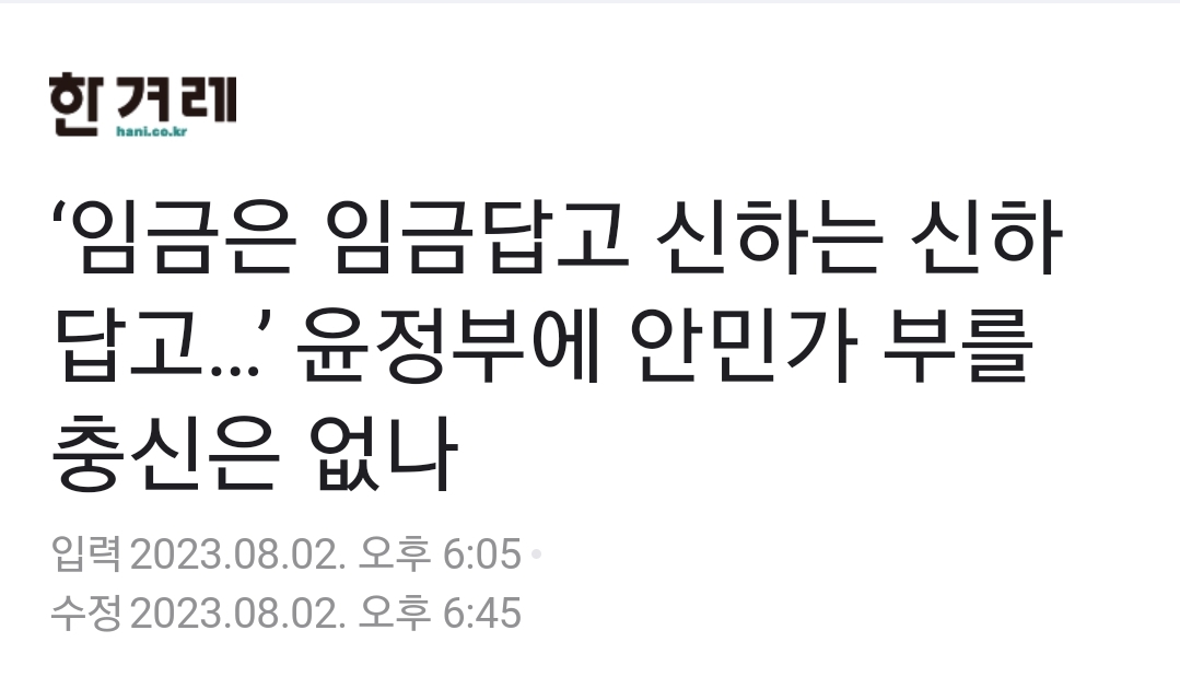 [여시뉴스데스크]‘임금은 임금답고 신하는 신하답고…’ 윤정부에 안민가 부를 충신은 없나 작성자설윤ㅇㅏ|작성시간23.08.24|조회수753 목록 댓글 5 글자크기 작게가 글자크기 크게가 출처 : https://naver.me/xjJMRAy3 다음검색 현재 게시글 추가 기능 열기 북마크 공유하기 신고 센터로 신고 댓글 댓글 5 댓글쓰기 답글쓰기 댓글 리스트 작성자브래드이발소 | 작성시간 23.08.24 드디어 언론에서 할말하네 작성자낼룸 | 작성시간 23.08.24 제목 너무 잘 지엇따 작성자네오그린 | 작성시간 23.08.24 이제와서 작성자재극기부대모드ON | 작성시간 23.08.24 한겨레네 조중동 기자놈들은 뭘 썼는지 슬슬 한번 가볼까.. 작성자남냠냠 | 작성시간 23.08.24 윗물이 썩었는데 아랫물이 맑겠냐고 댓글 전체보기