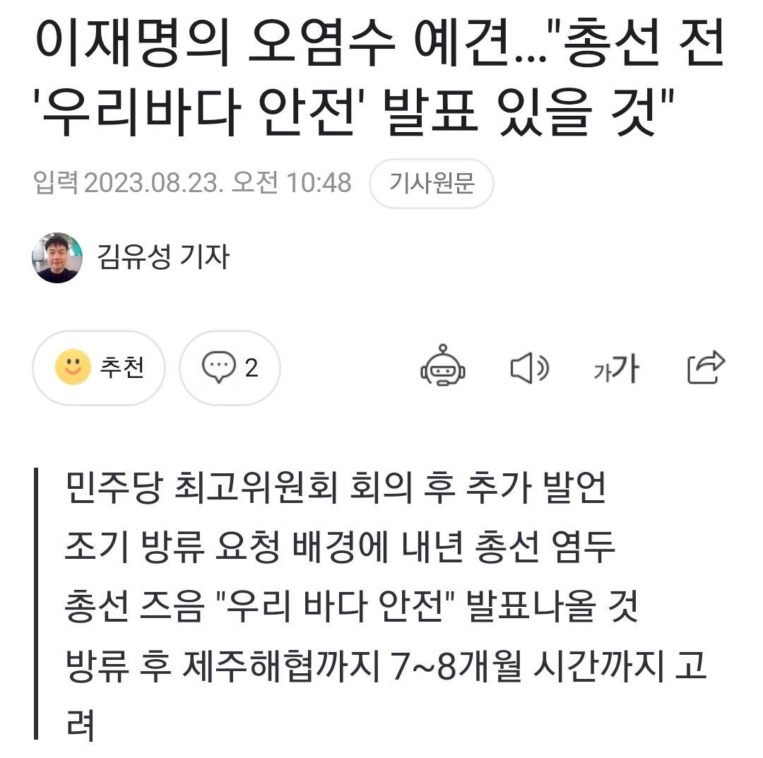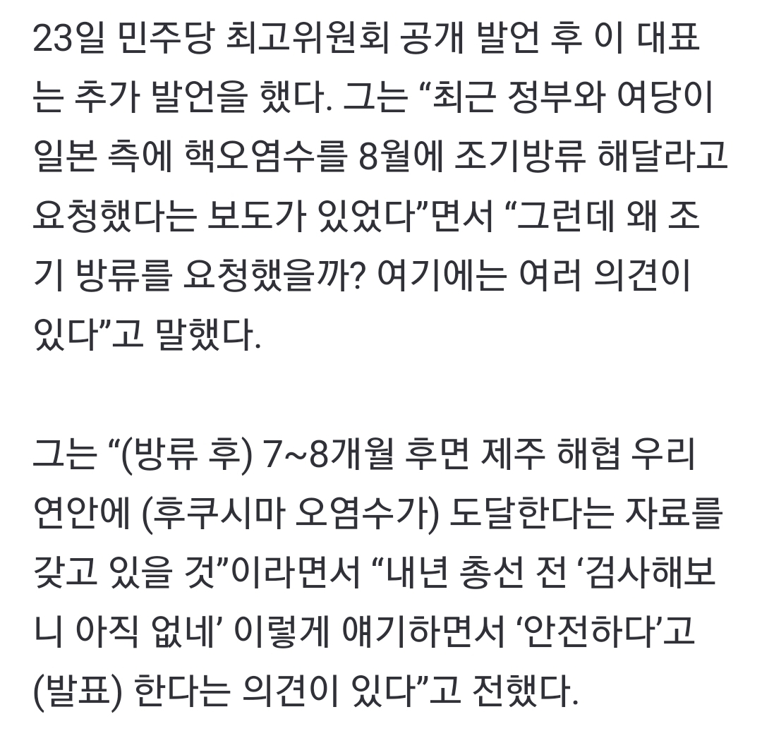 한국정부가 일본에 조기방류를 요청했다는 일본발 기사가 터짐. 오염수 방류하고 7~8개월 뒤면 제주도에 도착한다는 한국 언론의 보도가 있었음. 그래서 오염수 방류를 서둘러 하고 총선 전 검사했는데 안 왔다고 결국 안전하다고 언플하려고! pic.twitter.com/ZV8slnbpiv