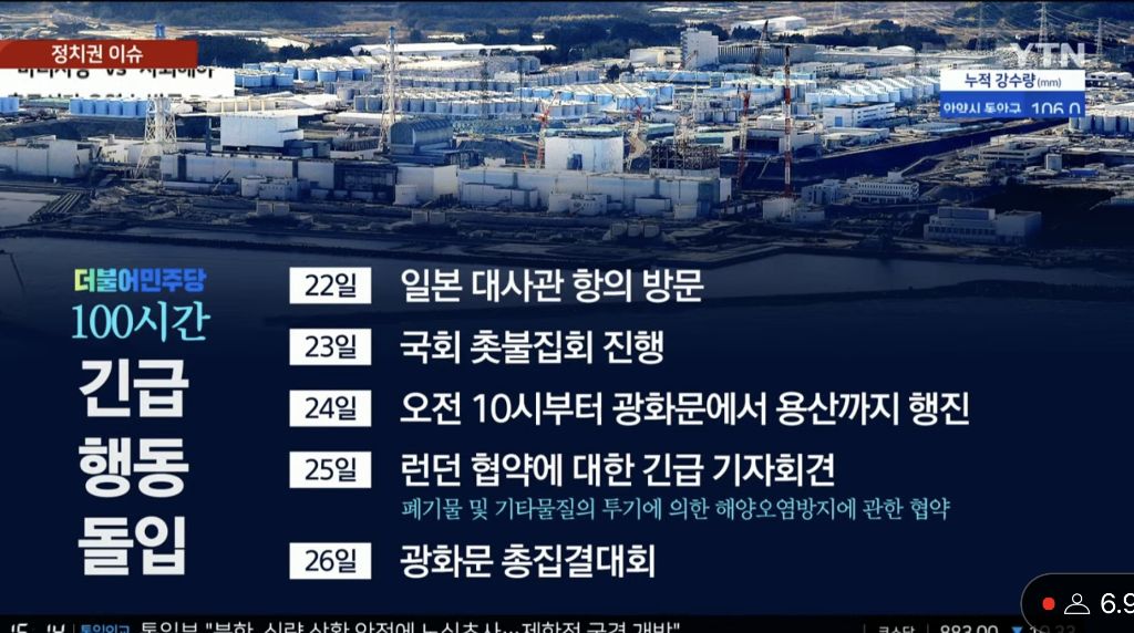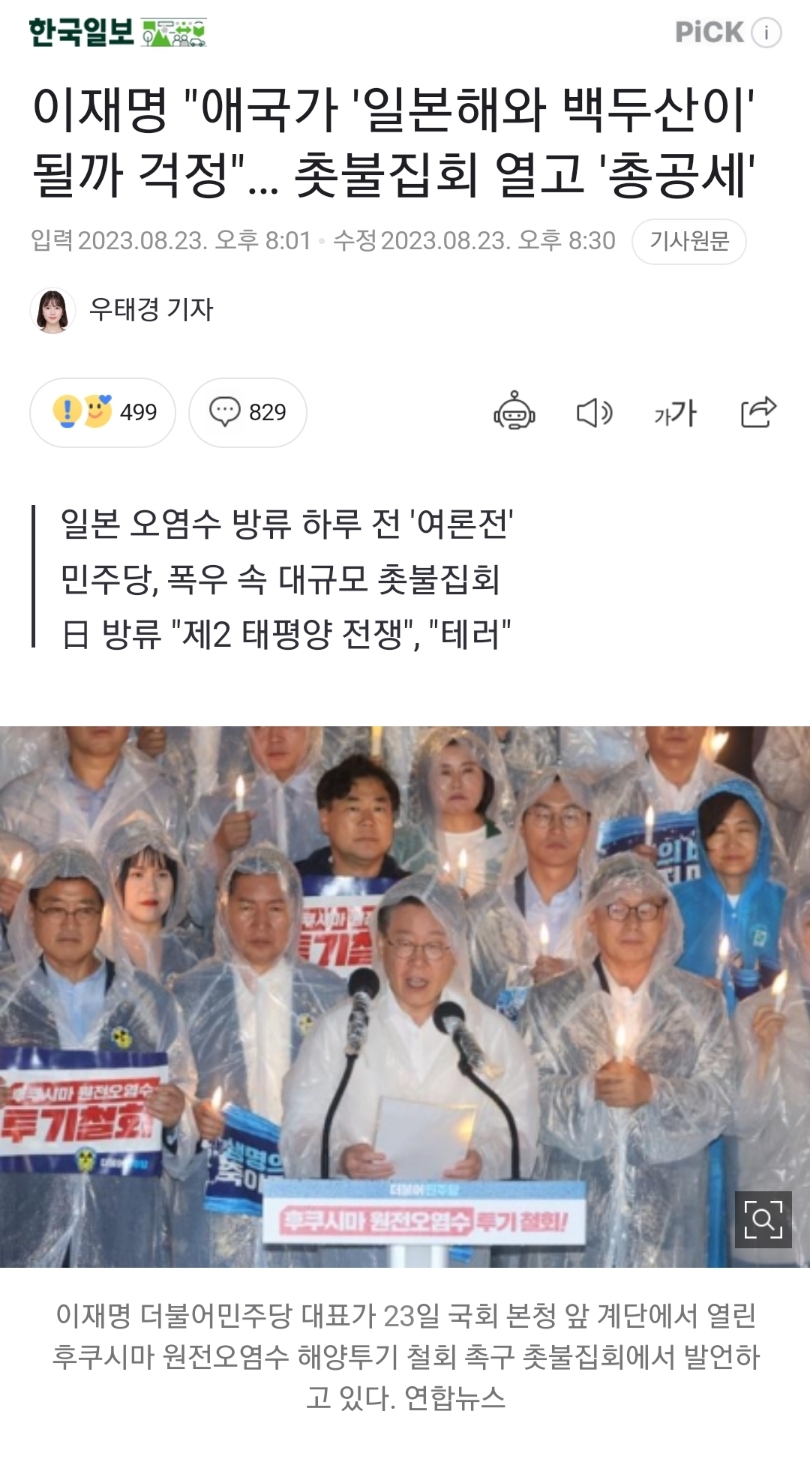 더불어민주당은 일본의 후쿠시마 원전 오염수 방류를 하루 앞둔 23일 국회에서 대규모 촛불집회를 열고 오염수 방류 저지를 위한 총력전을 벌였다. 일본의 오염수 방류를 '제2의 태평양전쟁' '오염수 테러' 등으로 규정하는 동시에 일본 정부의 결정에 "문제가 없다"고 밝힌 윤석열 정부를 향해서도 한껏 날을 세웠다.
