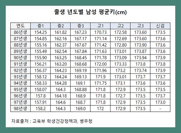 86년생 173.5 98년생 173으로 0.5cm 줄음