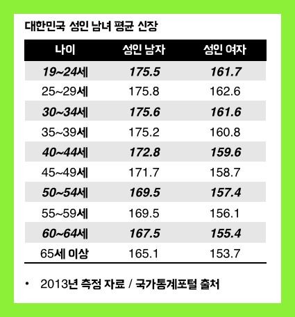 대한민국 성인 남녀 평균 신장