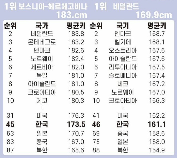 2016년 기준으로 averageheight.co에 따르면 대한민국의 남자 평균키는 173.5cm이며 여자 평균키는 161.1cm라고 발표했습니다. 발표된 순위에서 대한민국은 남자는 45위 였으며, 여자는 46위였다.