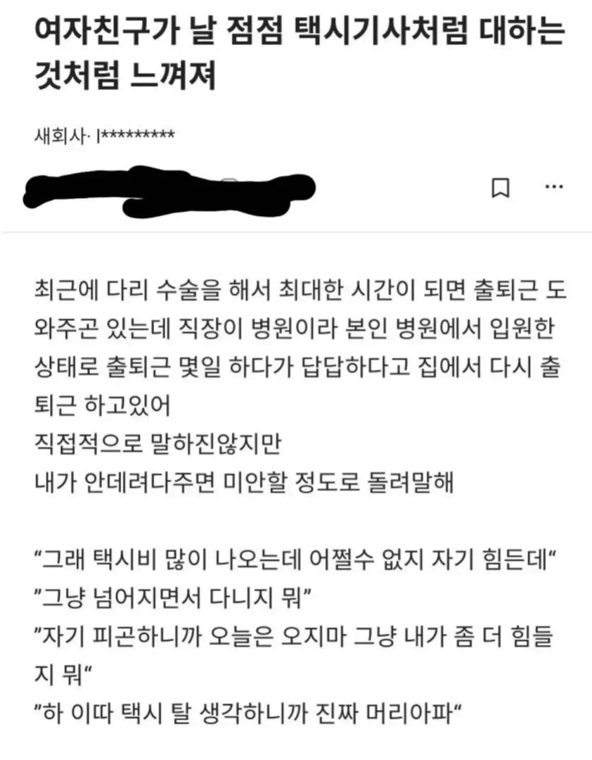 [흥미돋]여자 친구가 점점 날 택시 기사로 대하는 것 같아 작성자서한솔|작성시간23.08.25|조회수10,545 목록 댓글 47 글자크기 작게가 글자크기 크게가 출처 : https://www.instagram.com/p/CwPrrc2yvs8/?igshid=MzRlODBiNWFlZA==로그인 • Instagram여기를 눌러 링크를 확인하세요www.instagram.com그런 거 하나 못하냐? 다음검색 현재 게시글 추가 기능 열기 북마크 공유하기 신고 센터로 신고 댓글 댓글 47 댓글쓰기 답글쓰기 댓글 리스트 작성자F A K E R | 작성시간 23.08.25 기사님만웡더드릴게요 ㅋ 작성자14억 | 작성시간 23.08.25 헤어지면 되는거지 친구도 아니고 인터넷에 뭔 말을 바라는거지 같이 욕해달란건감 작성자아모스딱풀초강력 | 작성시간 23.08.26 죠? 작성자필리스 | 작성시간 23.08.26 택시없는 택시기사 작성자Super Shy | 작성시간 23.08.26 헤어지세욧 댓글 전체보기