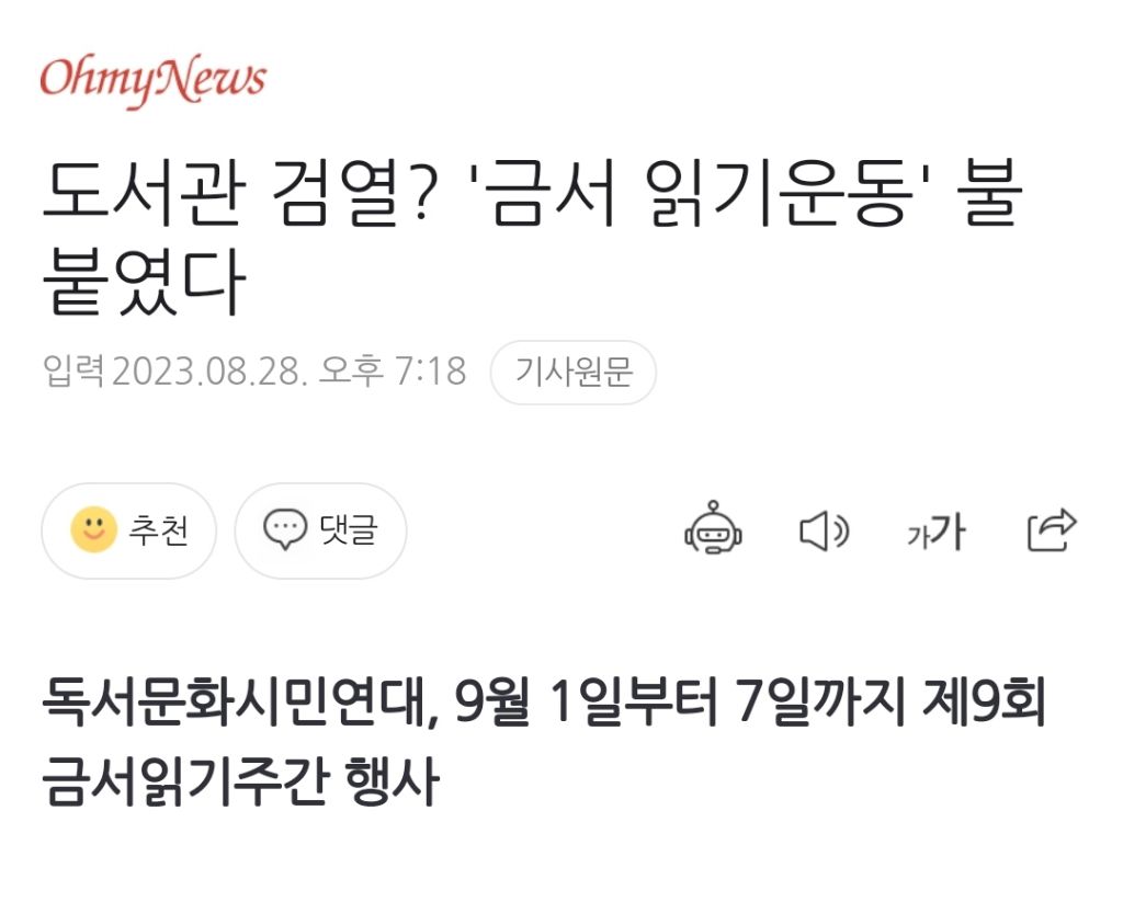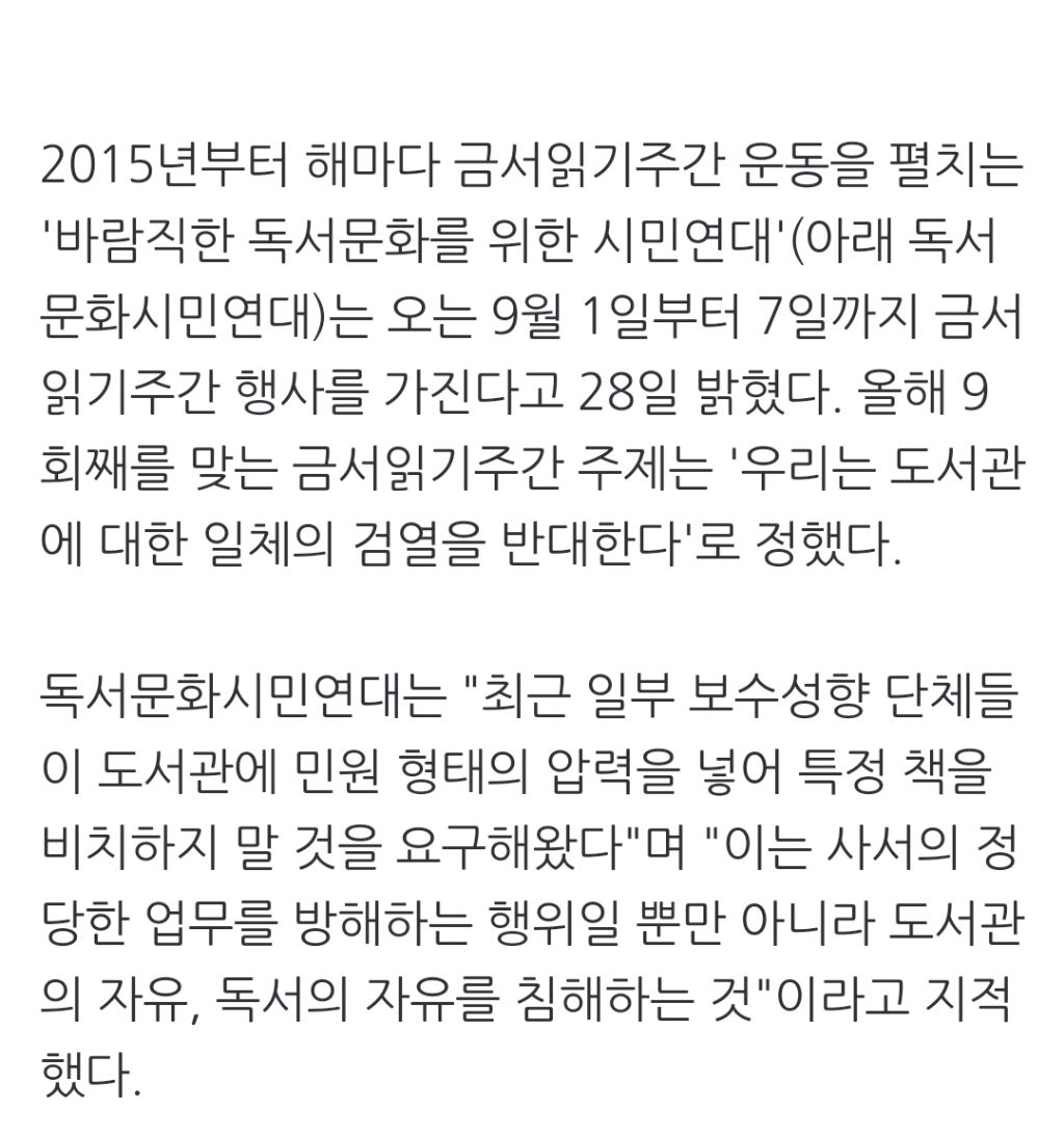 [여시뉴스데스크]도서관 검열? '금서 읽기운동' 불붙였다 작성자드루리|작성시간23.08.29|조회수3,932 목록 댓글 9 글자크기 작게가 글자크기 크게가 출처 : https://naver.me/51a6ieBG도서관 검열? '금서 읽기운동' 불붙였다독서문화시민연대, 9월 1일부터 7일까지 제9회 금서읽기주간 행사 ▲ 최근 서울시의원이 서울교육청에게 구입내역을 요구해 물의 빚은 도서목록들. ⓒ 독서문화시민연대 2015년부터 해마다 금서n.news.naver.com전문은 출처로▲ 최근 서울시의원이 서울교육청에게 구입내역을 요구해 물의 빚은 도서목록들 ⓒ 독서문화시민연대하략 다음검색 현재 게시글 추가 기능 열기 북마크 공유하기 신고 센터로 신고 댓글 댓글 9 댓글쓰기 답글쓰기 댓글 리스트 작성자짬지털 | 작성시간 23.08.29 아니 야동규제는 알권리를 어쩌구하더니 성교육책은 규제를함? 작성자이성과감성 | 작성시간 23.08.29 성매매업소나 어케 해라;; 작성자부라댝댝닥닥 | 작성시간 23.08.29 나도 참여^^이상하게 그 당이 정권잡았을때 도서 검열 공문 오더라? 작성자쿠룽지 | 작성시간 23.08.29 여자나오는 룸싸롱 성매매업소 이런데나 잡아 그건 또 관계자가 있어서 안되려나 ㅋㅋㅋㅋㅋ 작성자기쁨이없는김여시 | 작성시간 23.08.29 엥 저런건 성교육 아님?? 댓글 전체보기