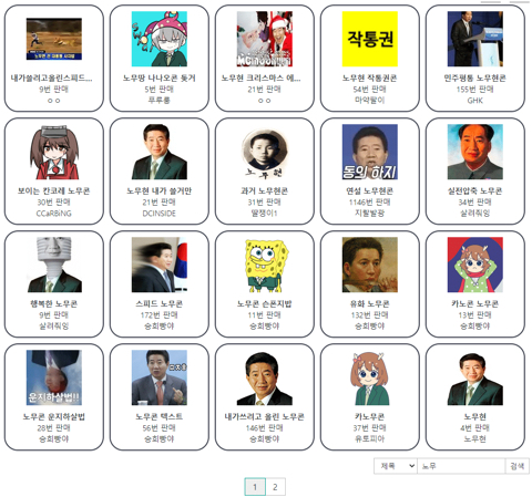 (나무위키 운영사가 운영하는 '아카라이브'에서 판매중인 이모티콘 '아카콘' 중 노 전 대통령을 희화화하는 수많은 이모티콘들.)