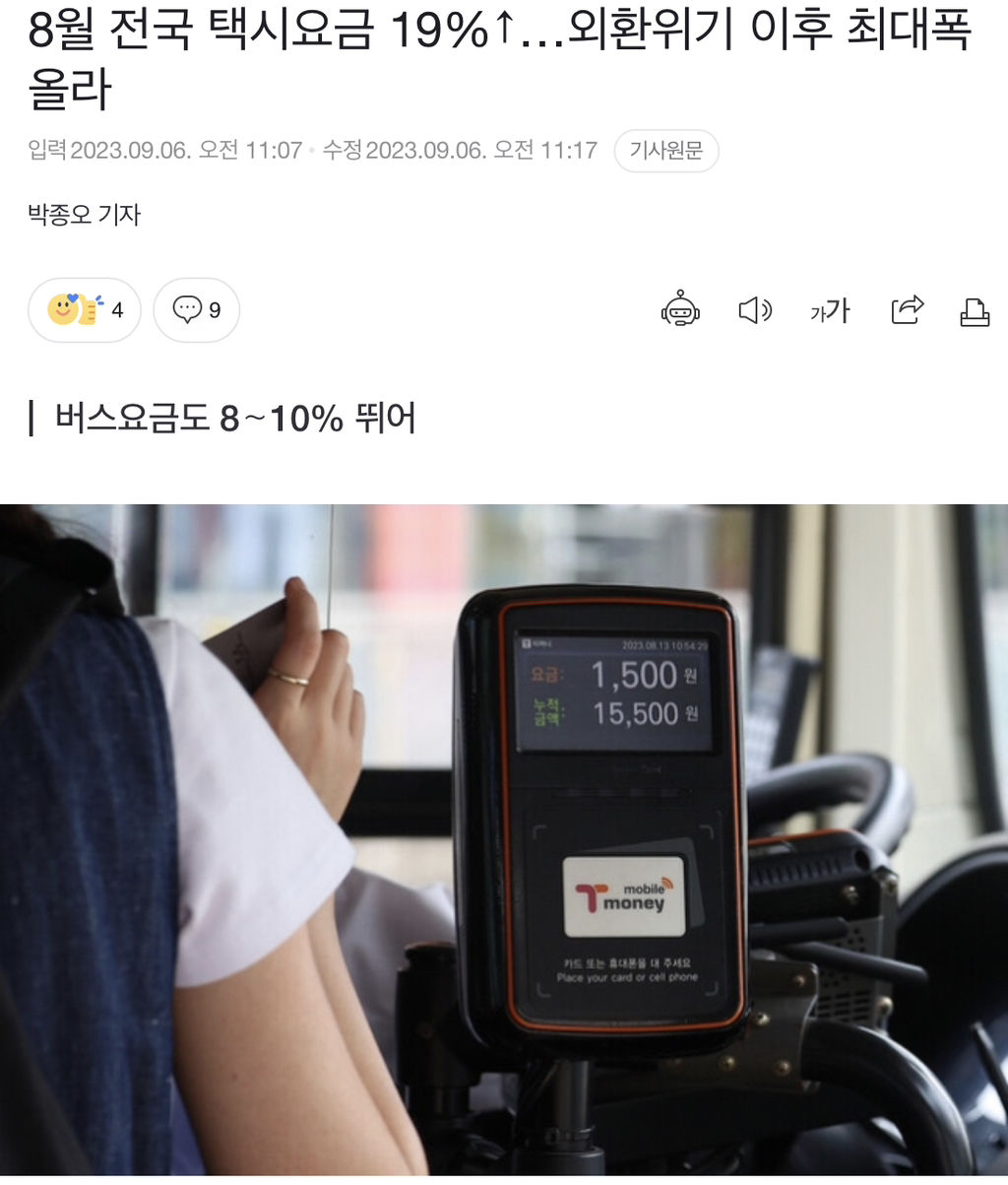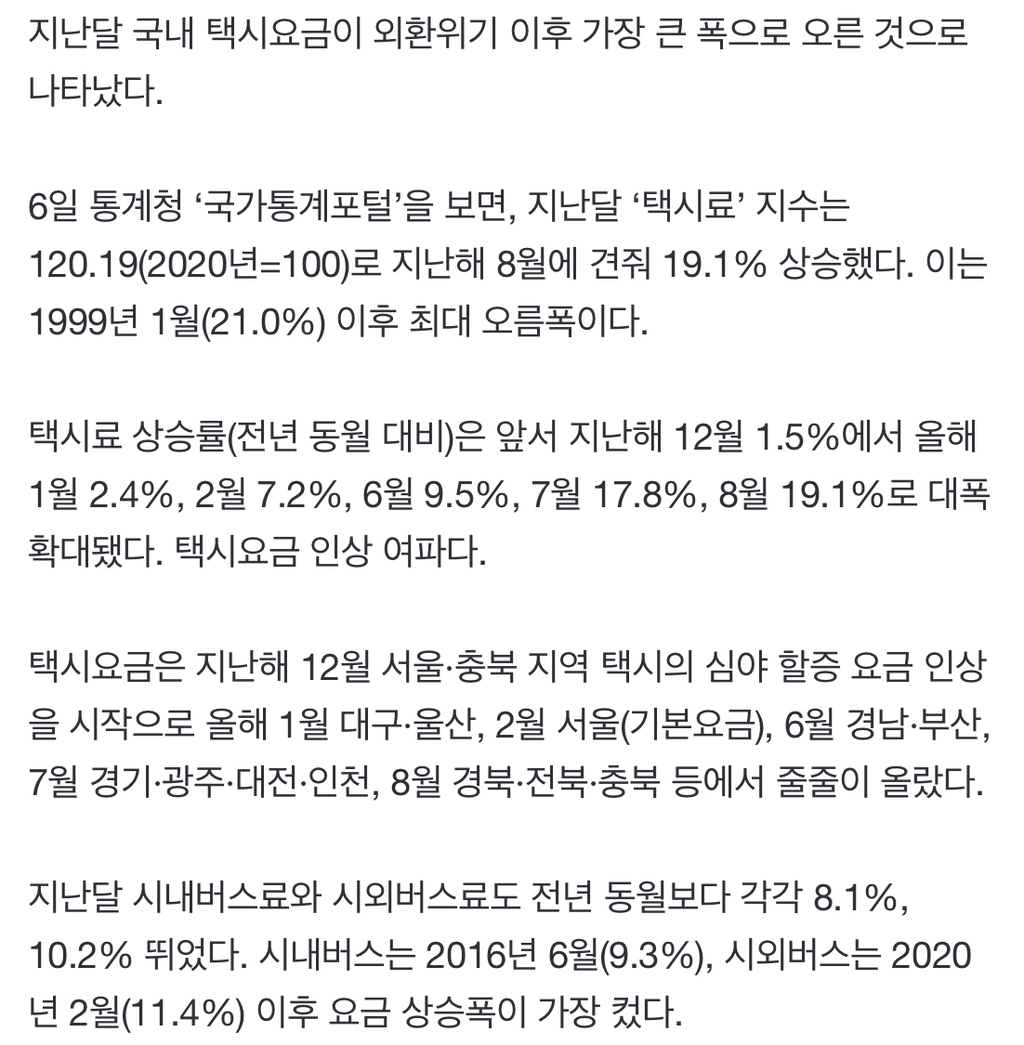 [여시뉴스데스크]8월 전국 택시요금 19%↑…외환위기 이후 최대폭 올라 작성자따뜻한 햇빛|작성시간23.09.06|조회수705 목록 댓글 3 글자크기 작게가 글자크기 크게가 출처 : https://n.news.naver.com/mnews/article/028/0002655349?sid=1018월 전국 택시요금 19%↑…외환위기 이후 최대폭 올라지난달 국내 택시요금이 외환위기 이후 가장 큰 폭으로 오른 것으로 나타났다. 6일 통계청 ‘국가통계포털’을 보면, 지난달 ‘택시료’ 지수는 120.19(2020년=100)로 지난해 8월에 견줘 19.1% 상승했n.news.naver.com전문 링크 참고 다음검색 현재 게시글 추가 기능 열기 북마크 공유하기 신고 센터로 신고 댓글 댓글 3 댓글쓰기 답글쓰기 댓글 리스트 작성자타켁 | 작성시간 23.09.06 미쳤다 죄다 오른다.. 월급 겨우 올리면 뭐해 다 나가고 없는데 ㅅㅂ 작성자필통쓰 | 작성시간 23.09.06 월급빼고 다 오르네ㅠ 택시 기사들은 요금 오르면 월급 오르나? 작성자연세초코우유크림빵 | 작성시간 23.09.06 또 처올려? 댓글 전체보기