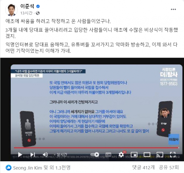 먼저 여당 내 대표적인 윤석열 정부에 의한 희생자 이준석 전 국민의힘 대표는 5일 밤에 본인의 페이스북에 더탐사 기사를 공유하며 자신의 심경을 담은 짧은 글을 올렸다. 그리고 아예 상단 고정 게시물로 못을 박아놓았다.