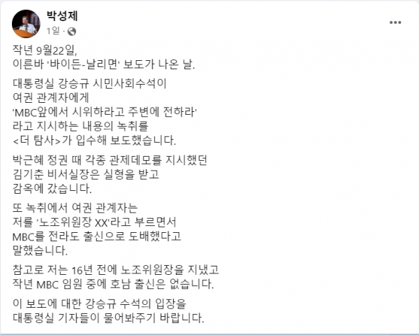 박성제 전 MBC 사장도 5일 본인의 페이스북을 통해 강승규 대통령실 시민사회소통수석의 관제데모 사주 의혹 건에 대해 자신의 심경을 밝혔다. 박 전 사장은 본인의 페이스북에 “작년 9월22일, 이른바 '바이든-날리면' 보도가 나온 날. 대통령실 강승규 시민사회수석이 여권 관계자에게 'MBC앞에서 시위하라고 주변에 전하라'라고 지시하는 내용의 녹취를 <더 탐사>가 입수해 보도했습니다.”고 더탐사의 기사를 공유했다.