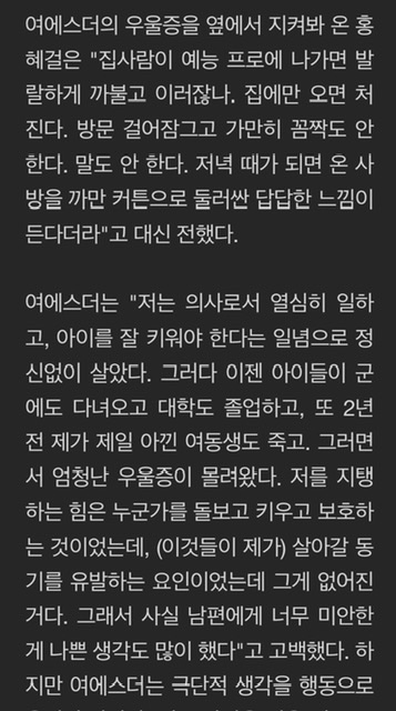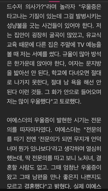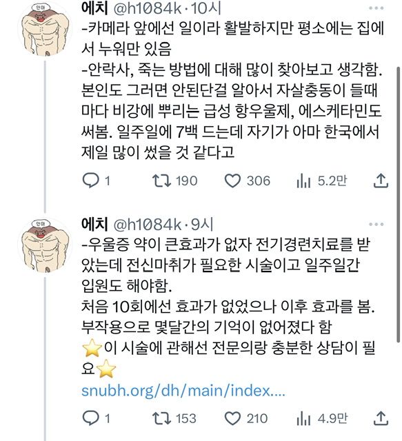 작성자다스림 작성시간 23.09.06 나도 우울증 있어서 알고리즘으로 전기치료 하셨다는 내용 말씀하시는 영상 봤는데 스스로 맛집 여행가고싶은 생각 안든다는거 진짜 ㄹㅇ이야... 나도 그러거든 그리고 우리집도 외할아버지가 자살하셨댔어 그 사실도 얼마전에 알게됨... 글구 나도 되게 통제적인 집안에서 컸어..