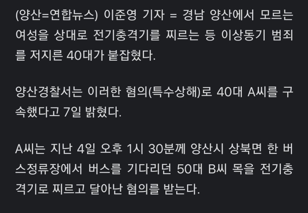 [여시뉴스데스크]양산서 버스 기다리던 모르는 여성에 전기충격기 찌른 40대 구속 작성자YESUNG|작성시간23.09.07|조회수6,221 목록 댓글 23 글자크기 작게가 글자크기 크게가 출처 : 여성시대 YESUNGhttps://v.daum.net/v/20230907113612677양산서 버스 기다리던 모르는 여성에 전기충격기 찌른 40대 구속(양산=연합뉴스) 이준영 기자 = 경남 양산에서 모르는 여성을 상대로 전기충격기를 찌르는 등 이상동기 범죄를 저지른 40대가 붙잡혔다. 양산경찰서는 이러한 혐의(특수상해)로 40대 A씨를 구속했v.daum.net자세한 내용은 전문으로 다음검색 현재 게시글 추가 기능 열기 북마크 공유하기 신고 센터로 신고 댓글 댓글 23 댓글쓰기 답글쓰기 댓글 리스트 작성자코드 쿤스트 | 작성시간 23.09.07 진짜 시발ㅋㅋ 작성자고양이타타 | 작성시간 23.09.07 죽어그냥 작성자초코케익 | 작성시간 23.09.07 뭐ㅜ야 ㅡㅡ 옆동네잖아 미친놈이.. 작성자하쿠나마타다 | 작성시간 23.09.07 미친새끼 작성자좀짱 | 작성시간 23.09.07 미쳤다 기사전문에 소지품에서 스타킹이랑 당구공도 나왔대 이거 스타킹 안에 당구공 넣고 휘두르면 중상인데 댓글 전체보기