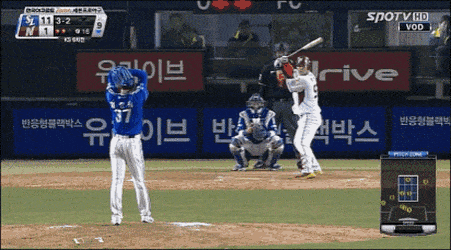 4구, 우중간에 중견수 뒤로 갑니다. 중견수, 자, 중견수가 잡았습니다! 경기종료! 2013 한국시리즈, 삼성 라이온즈의 우승입니다.