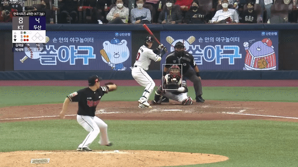 끌어당긴 타구 1루 쪽! 팀의 상징인 강백호가 베이스를 밟으면서!
