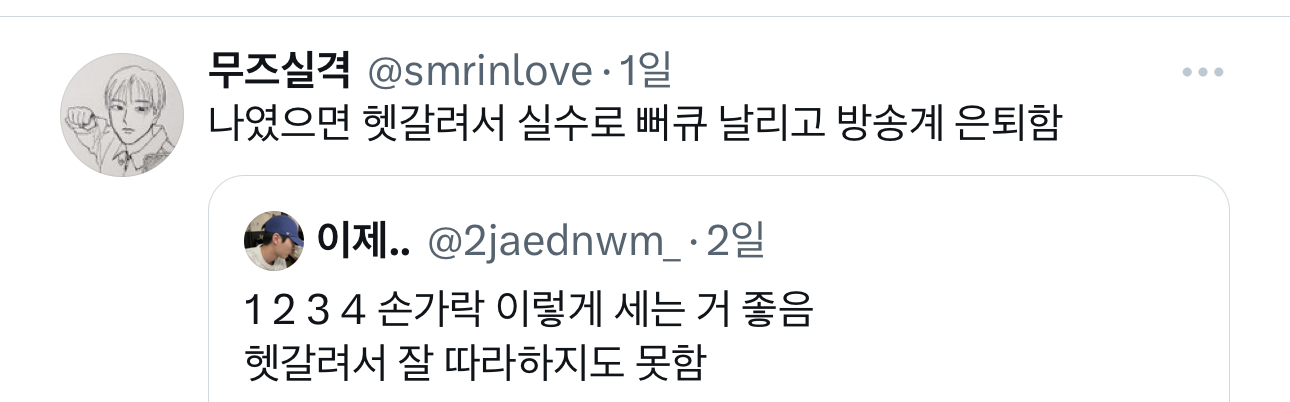 [흥미돋]나였으면 헷갈려서 실수로 뻐큐 날리고 방송계 은퇴함 작성자X file|작성시간23.09.13|조회수10,948 목록 댓글 12 글자크기 작게가 글자크기 크게가 출처 : https://twitter.com/smrinlove/status/1701170430386884956?s=46&t=v7QMmEln8v7WsADFKYn65g 다음검색 현재 게시글 추가 기능 열기 북마크 공유하기 신고 센터로 신고 댓글 댓글 12 댓글쓰기 답글쓰기 댓글 리스트 답댓글 작성자야돈야도온 | 작성시간 23.09.13 이여시 천재다 답댓글 작성자정신승리도 승리 | 작성시간 23.09.13 헐 천재여시 답댓글 작성자오늘의운세 | 작성시간 23.09.13 1부터 뻐큐한 나.. 작성자루이19세 | 작성시간 23.09.13 와 ㄹㅇ 뻐큐 저절ㄹ나오네 개웃기다 작성자누구새여 | 작성시간 23.09.13 나도 뻐큐 함 댓글 전체보기