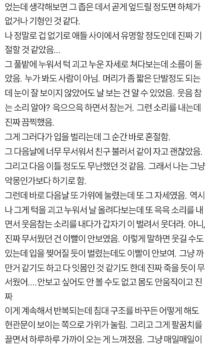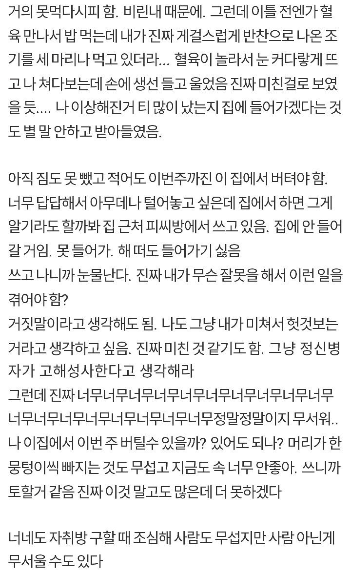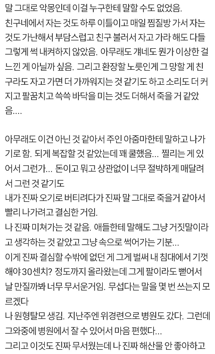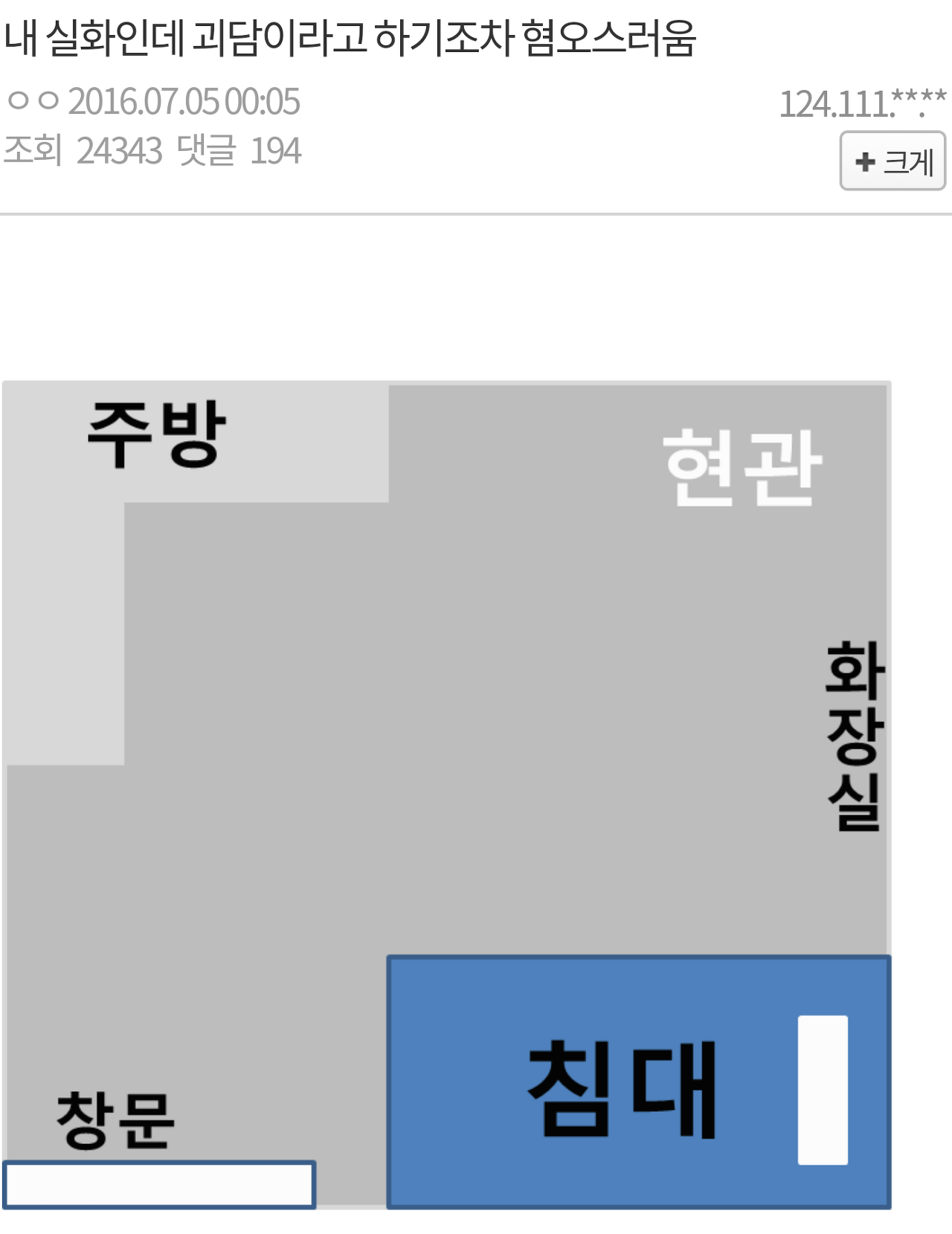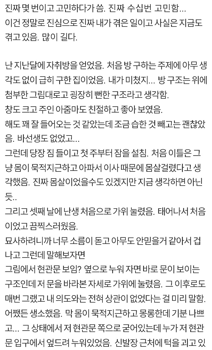 참고로 디씨 역학갤러리(?)에서 이 글 보더니 문 열었을때 침대 보이는 구조가 진짜 안 좋은거라고 당장 나오라고 그랬대