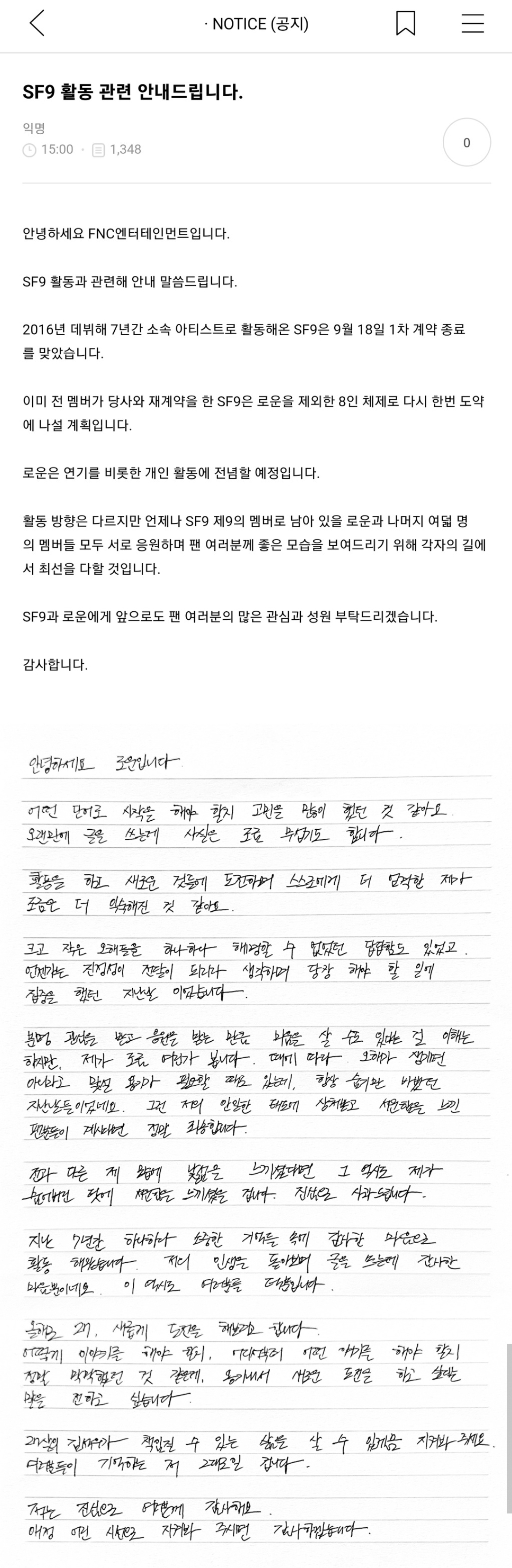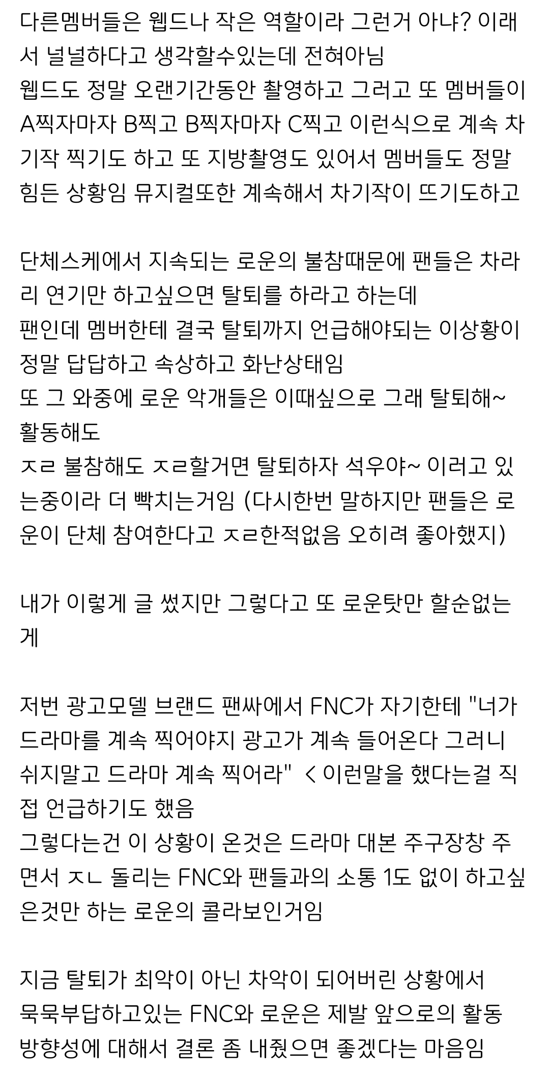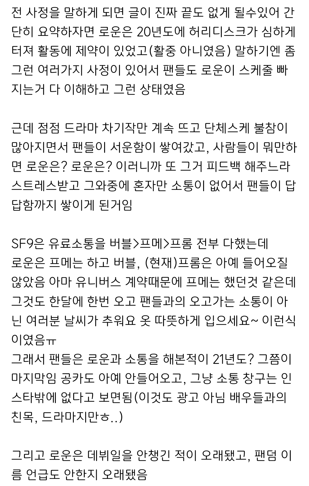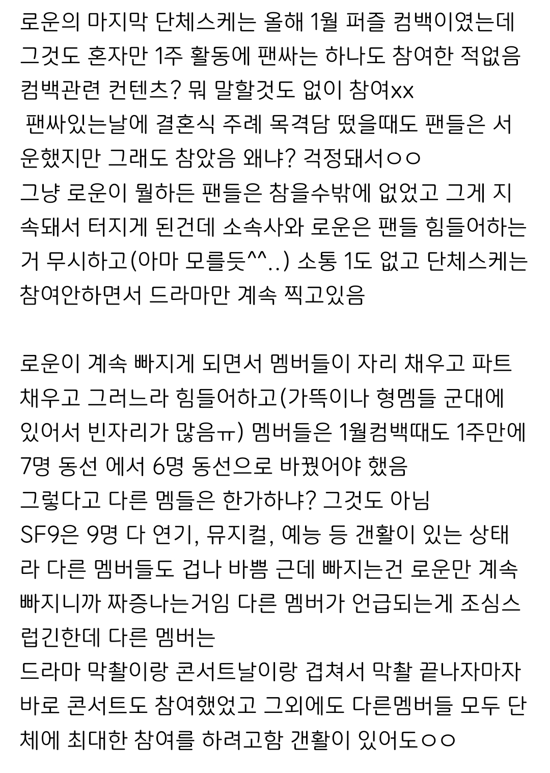 1. 팬들이 로운이 여러가지 사정으로 아이돌활동 계속 빠지는 거 참았는데