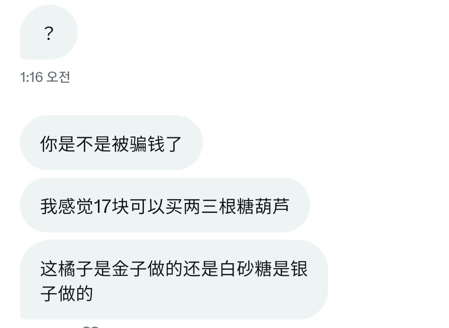 중국인 "아니 사기당함? 17위안이면 설탕바른 산사열매 두세꼬치는 삼. 귤이 금으로 만들어진거임 아니면 설탕이 은으로 만들어진거임?"