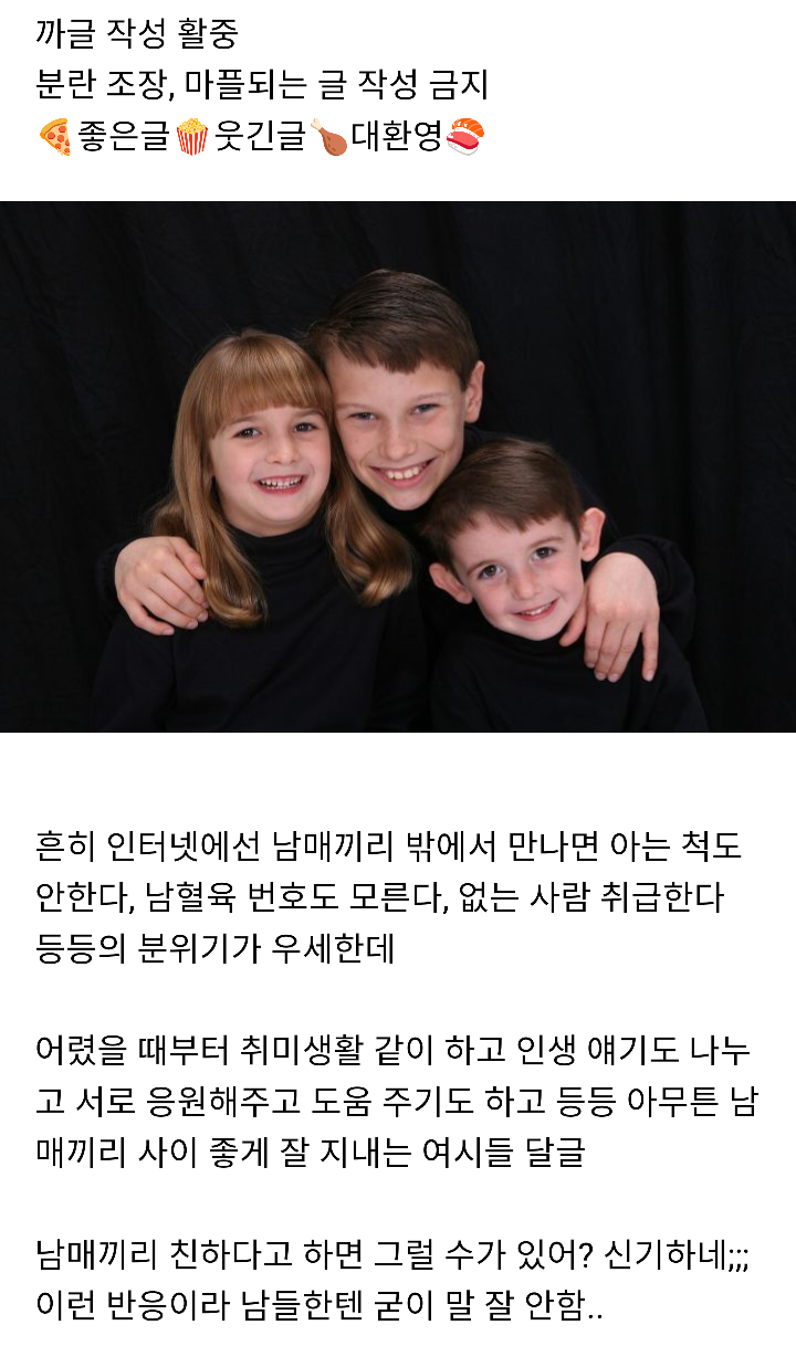 작성자플로리다뷰티그린 작성시간 23.09.26 나이차이 많이 나서 싸울일이 없음...