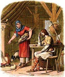 지치고 비통에 빠진 대왕은 한 집안에 들어가 신세를 졌는데, 집에 있던 부인은 이 누추한 거렁뱅이를 위해 케이크를 굽다가 잠시 밖으로 나가며 케이크가 타지 않도록 조심하라는 말을 남겼다. 그러나 어떻게 해야 군대를 다시 모을 수 있을지, 어떻게 해야 데인족들을 물리칠 수 있을지 너무나 깊게 생각하던 대왕은 배고픔도, 그리고 타고 있는 케이크도 잊어버리고 말았다. 이후 다시 들어온 부인이 타버린 케이크를 보고 노발대발한것은 이상한 일이 아니었다. "당신은 게으름뱅이로군요. 음식을 원하면서, 일하기는 싫어하니!" 왕은 그저 조용히 웃었고, (그가 그날 저녁을 먹었는지는 모르는 일이지만) 며칠 뒤에는 데인족을 물리치고 잉글랜드를 구원했다.