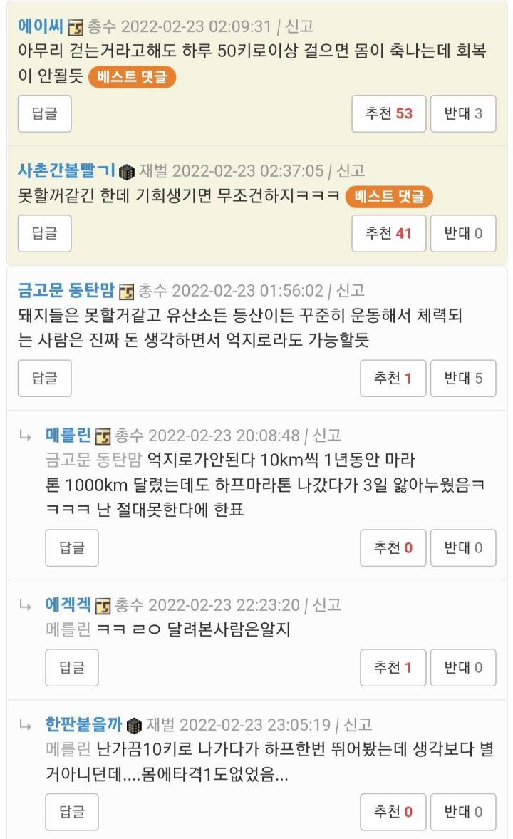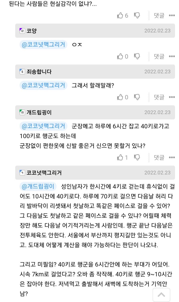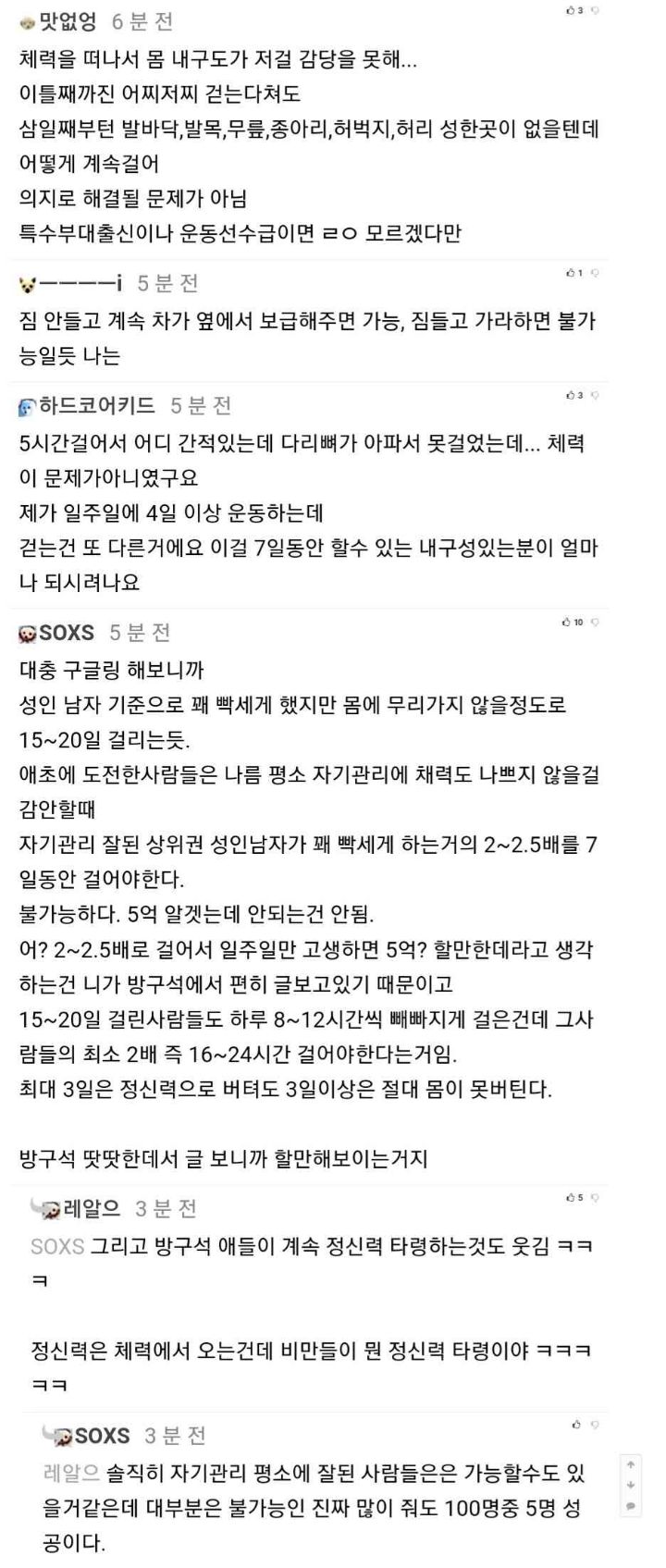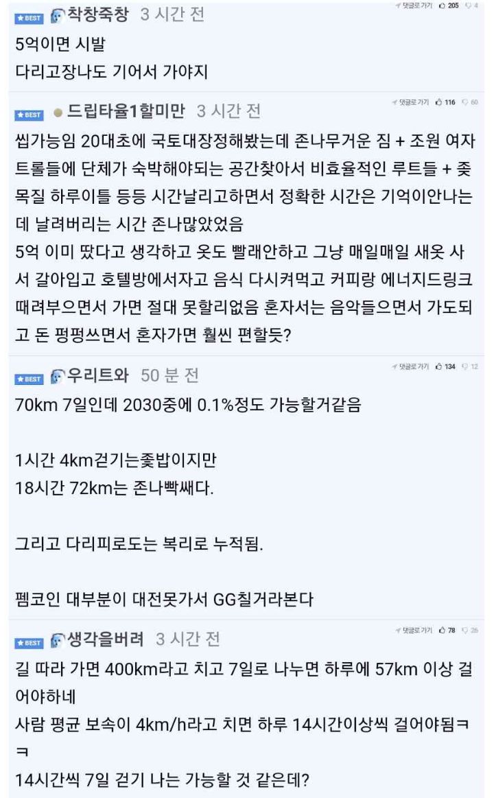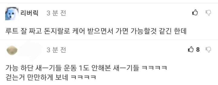 작성자한국인의 주식은 쌀이 아닌 존버 작성시간 23.10.03 저거 다리에 물집 잡히는 것도 계산해야함. 저렇게 오래 걸으면 체력이 문제가 아니라 다리 망가져...