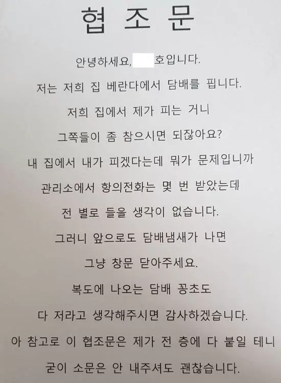 [흥미돋]저는 저희 집 베란다에서 담배를 핍니다 작성자사랑해도혼나지않는꿈이였다|작성시간23.10.04|조회수25,939 목록 댓글 248 글자크기 작게가 글자크기 크게가 출처 : 여성시대 사랑해도혼나지않는꿈이였다미친놈인지아님 피해본사람이 저집인척하고 붙인 고도의 협조문인지몰라도 담배피고 담배꽁초 치우지도 않았었나보네 다음검색 현재 게시글 추가 기능 열기 북마크 공유하기 신고 센터로 신고 댓글 댓글 248 댓글쓰기 답글쓰기 댓글 리스트 작성자빵집여시 | 작성시간 23.10.05 말투 베란다에 염산 뿌리고싶네..ㅎ 작성자비혼마녀등장 | 작성시간 23.10.05 층간소음도 그럼 지네 집에서 그냥 뛰는건데 ㅋㅋㅋ 괜찮겠냐고 작성자돈벼락들어온다 | 작성시간 23.10.06 문닫고 쳐피우라고 작성자지겨워지거워 | 작성시간 23.10.06 이야 윗집가서 뛰고싶넼ㅋㅋㅋㅋ 작성자prowdmon monika | 작성시간 23.10.06 엥 복도에 꽁초를 왜버려요 도라인가 댓글 전체보기