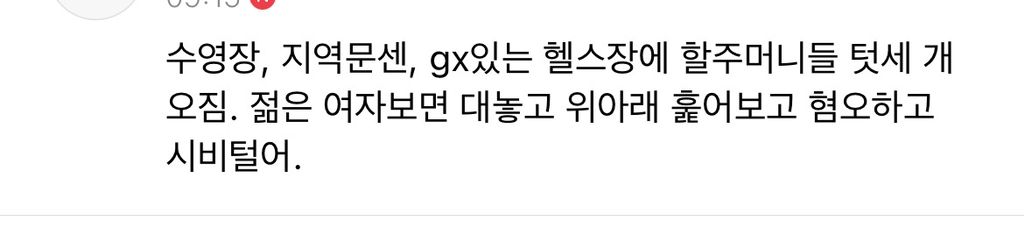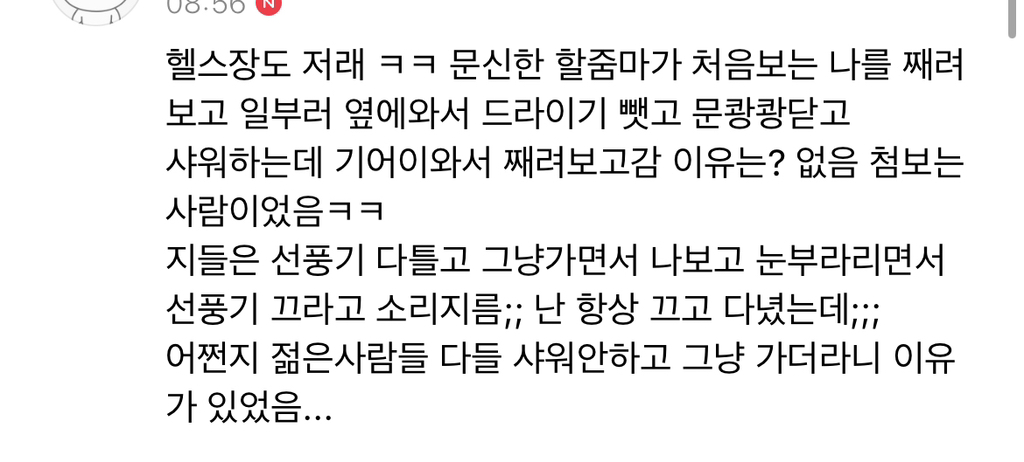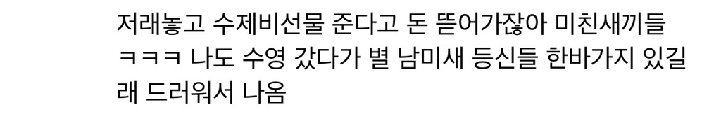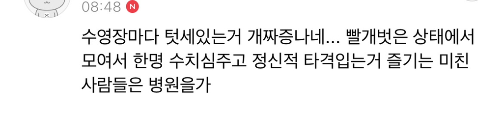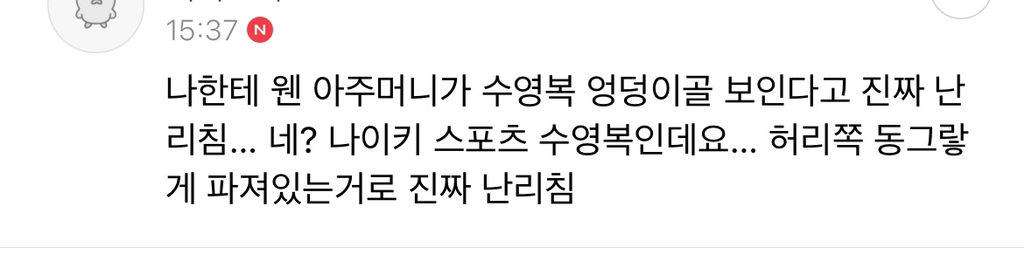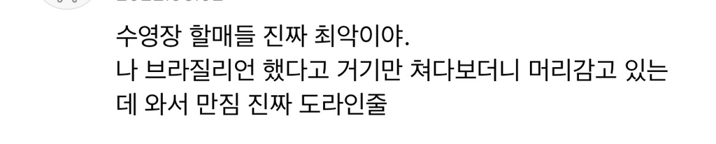작성자깜피왕가남 작성시간 23.10.05 ㅅㅂ 나도ㅋㅋㅋㅋ 아디다스 수영복 입고 다녔는데 샤워하고 있는데 와서 가슴골이 보여서 자기가 너무 민망하다면서 다른 수영복 사라함 (가슴이 큰것도아녀 ㅅㅂ) 수영장에 이얘기 전달하고 안나오겠다했더니 그래도 수영장측에서는 아줌마들 하나하나 불러다 물어보면서 그러시면 안된다했더니 그아줌마는 그런적없다고 난리를쳤다함