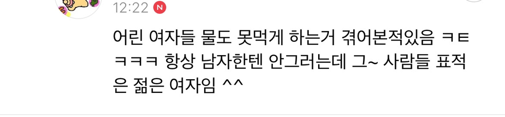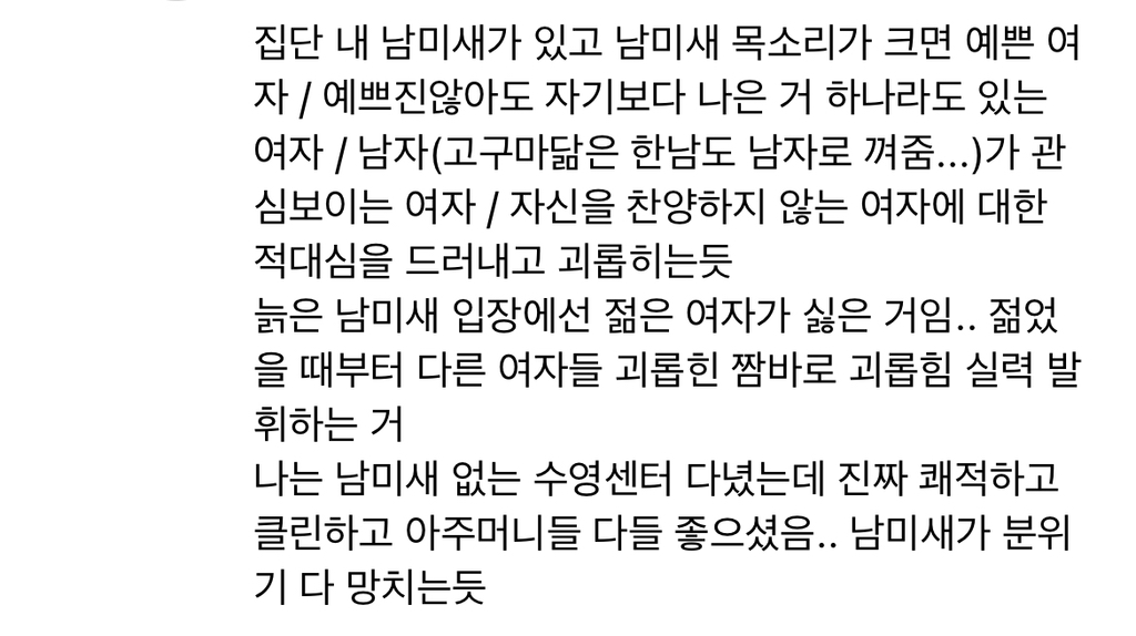 작성자닉네임이열입곱글자씩이나 작성시간 23.10.06 역시 미꾸라지 마냥 단체 분위기 아작내는거 남미새들이 일당백함 ㅋ 그렇게 젊은 여자 배척한다고 젊은 냄져들이 당신들한테 관심 안 가지고 당신네들이 젊어지는거 아닙니다 ^^ (늙은 남미새들은 이런 말에 타격 ㅈㄴ받으니까 쓴 말)