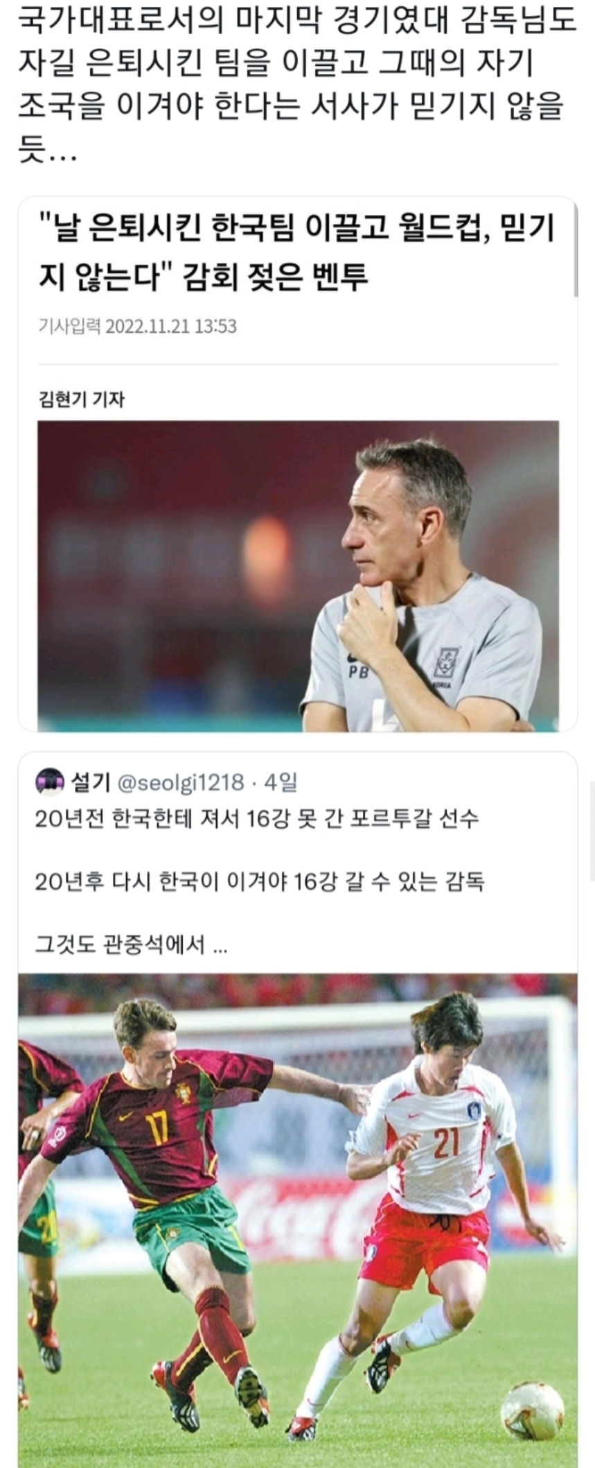 20년전 2002 월드컵때 우리나라에 패해 16강 진출 실패하고 은퇴한 포르투갈 선수였음